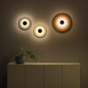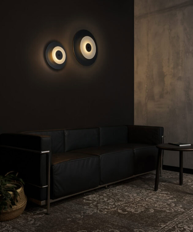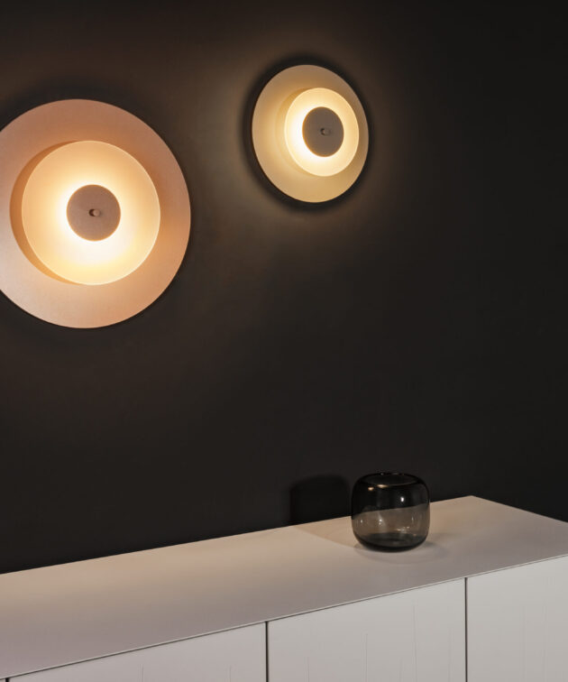 Aeroplan Wall is a modern wall light based on three contrasting circles of aluminium and frosted glass. The main powder-coated aluminium disc pairs with a smaller glass element, while discreet aluminium connectors emphasise its precise, minimalist form. On the wall, the lamp creates a graphic composition – subtle, yet full of character.