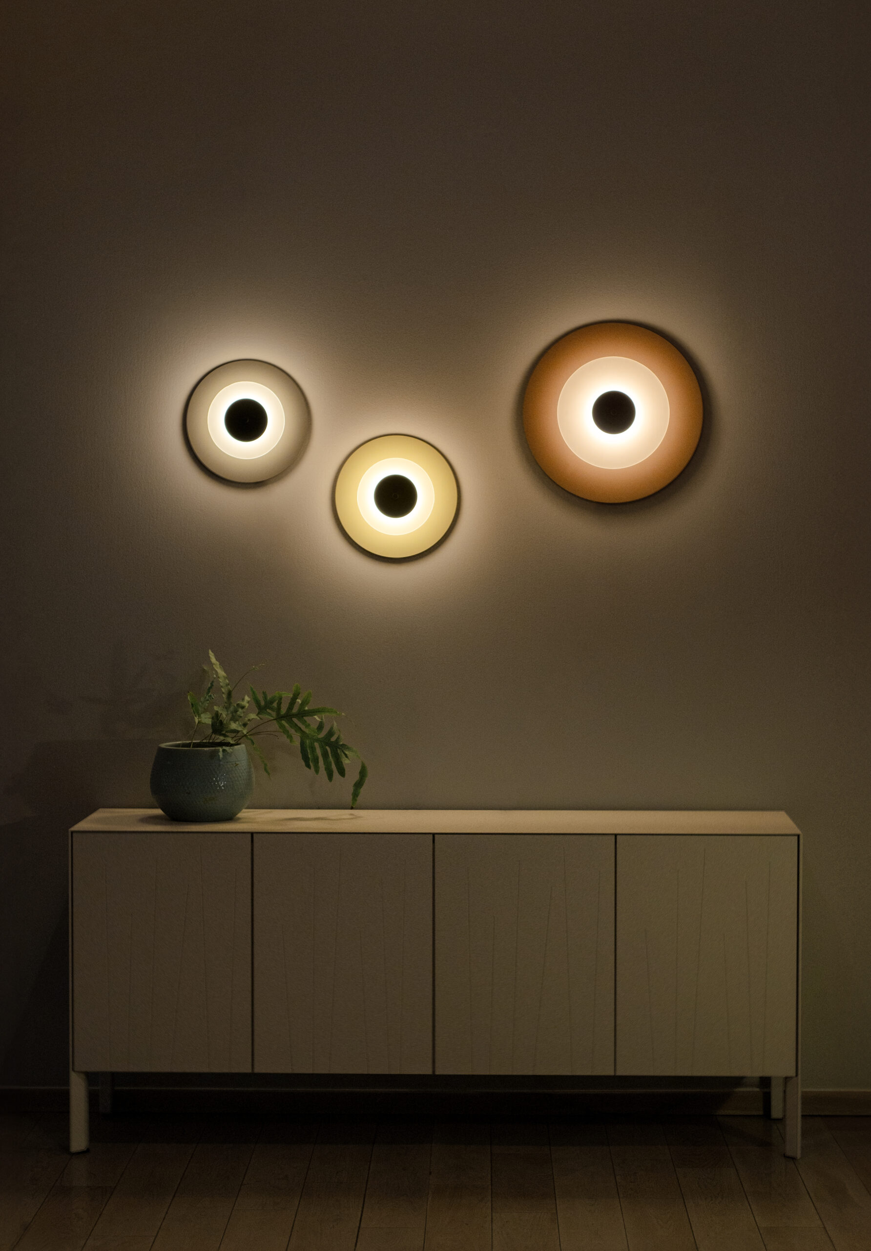 Aeroplan Wall is a modern wall light based on three contrasting circles of aluminium and frosted glass. The main powder-coated aluminium disc pairs with a smaller glass element, while discreet aluminium connectors emphasise its precise, minimalist form. On the wall, the lamp creates a graphic composition – subtle, yet full of character.