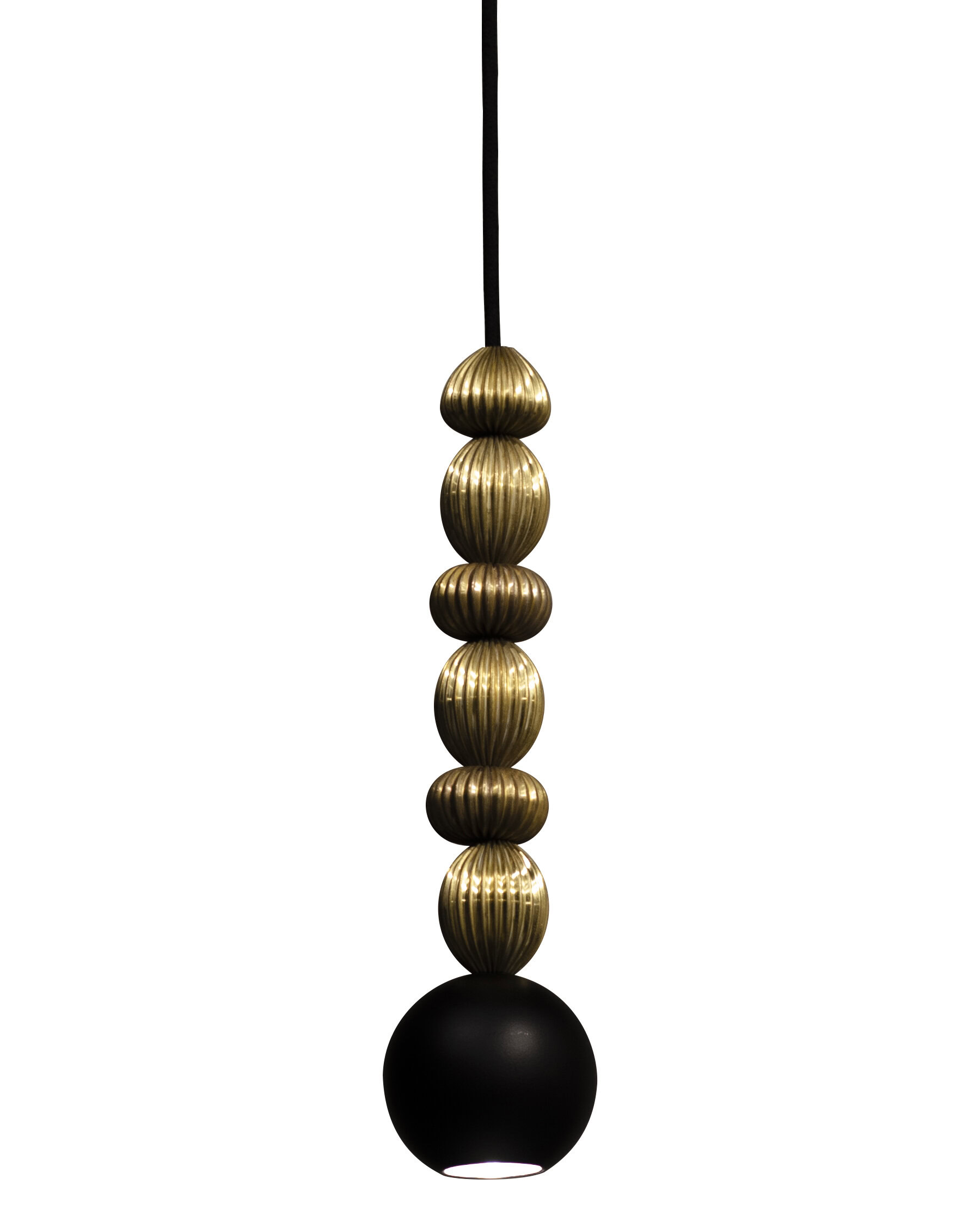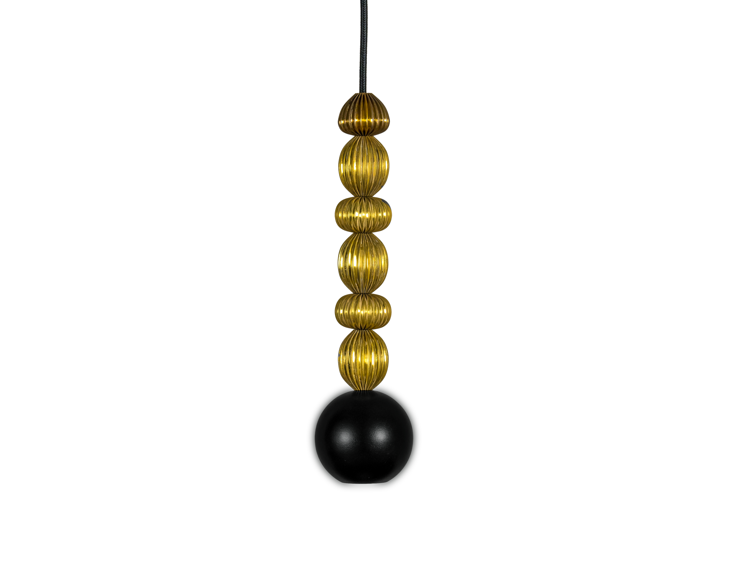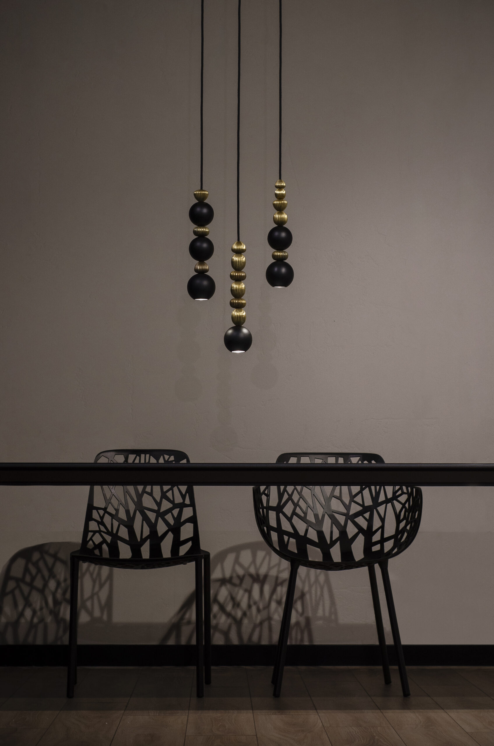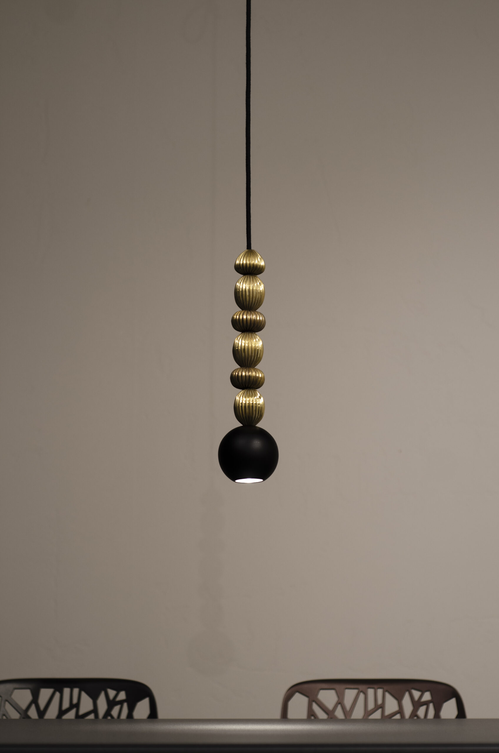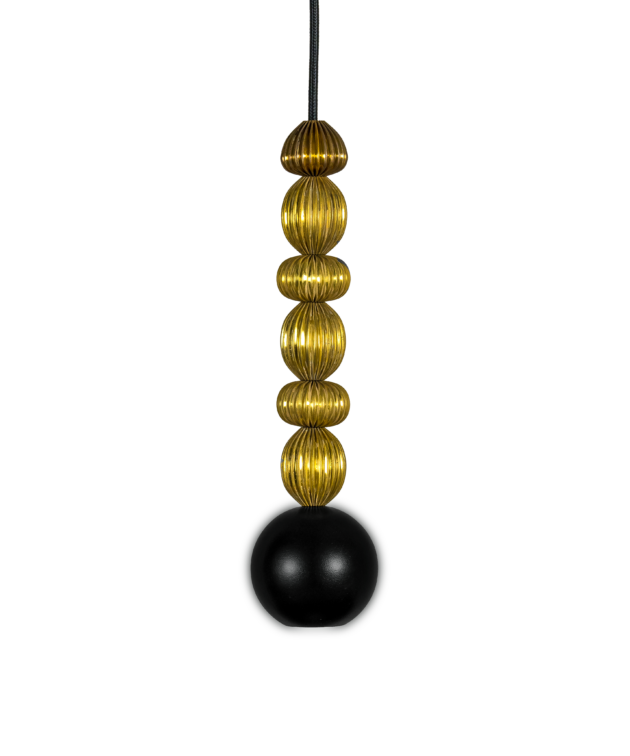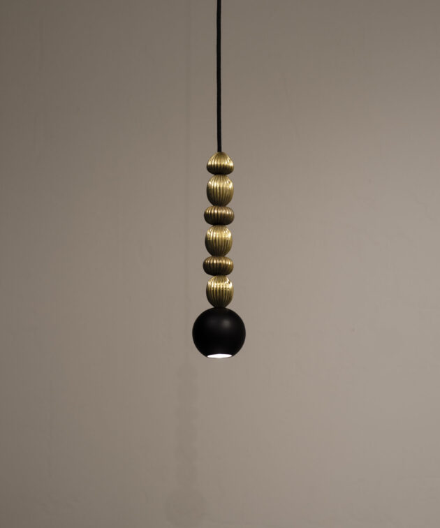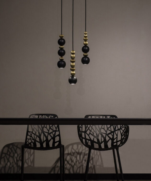 Bola Queen is a contemporary pendant lamp that combines a classic arrangement of spheres with decorative brass accents. The composition is based on powder-coated steel spheres rhythmically interwoven with solid brass rings. Available in three versions – with one, two or three spheres – the lamp can be precisely matched to the scale of the interior. The option of “multi” configurations on a shared ceiling rose further expands the design potential of this collection.