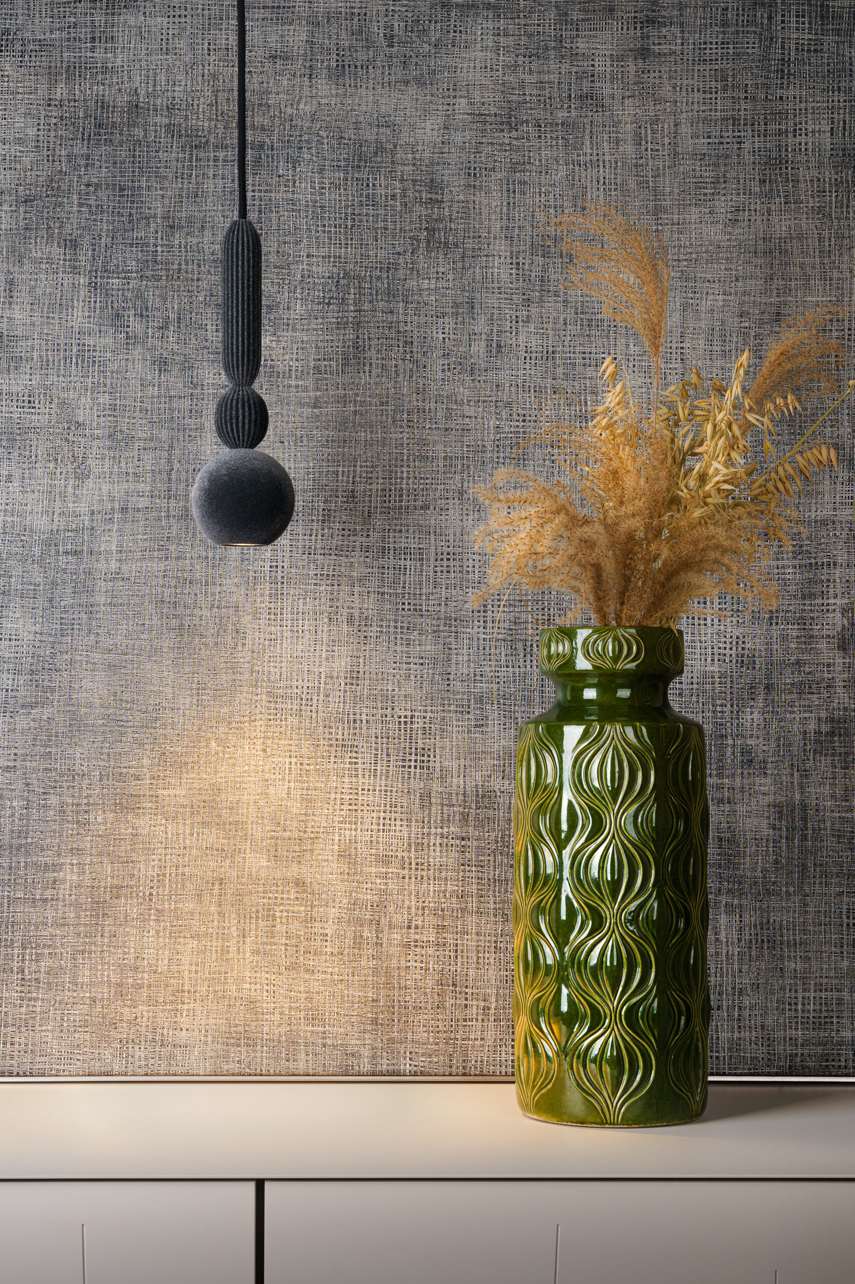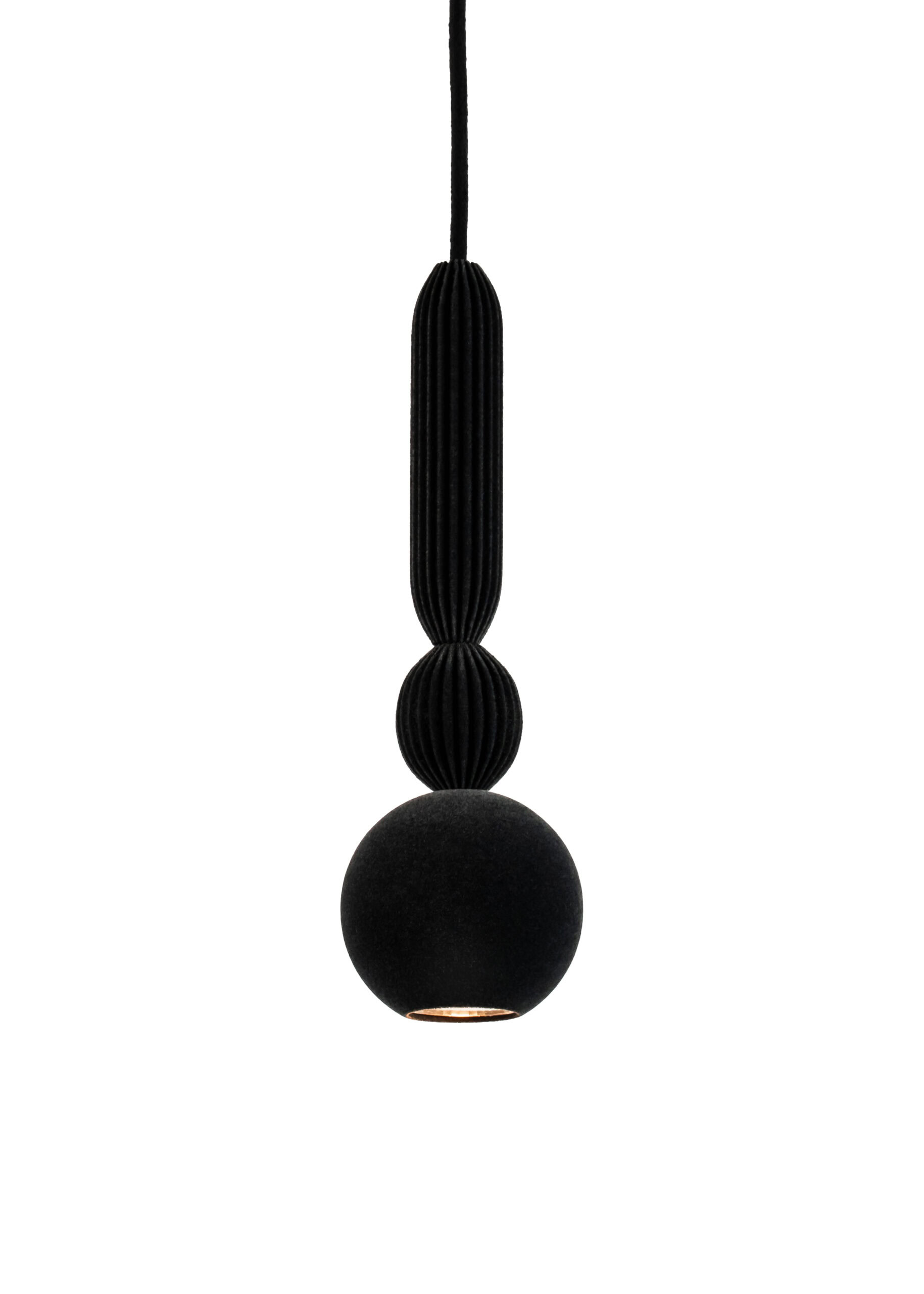 Bosca Velvet is an elegant pendant lamp that combines a raw form with a uniquely tactile surface. The steel sphere and two fluted rings – one small and one elongated – are finished directly with a Velvet coating, giving the whole composition a uniform, deeply matte texture. The delicate fluting of the rings contrasts with the smooth surface of the sphere, creating a balanced and refined composition. The lamp can be used individually or arranged in multi-point configurations.