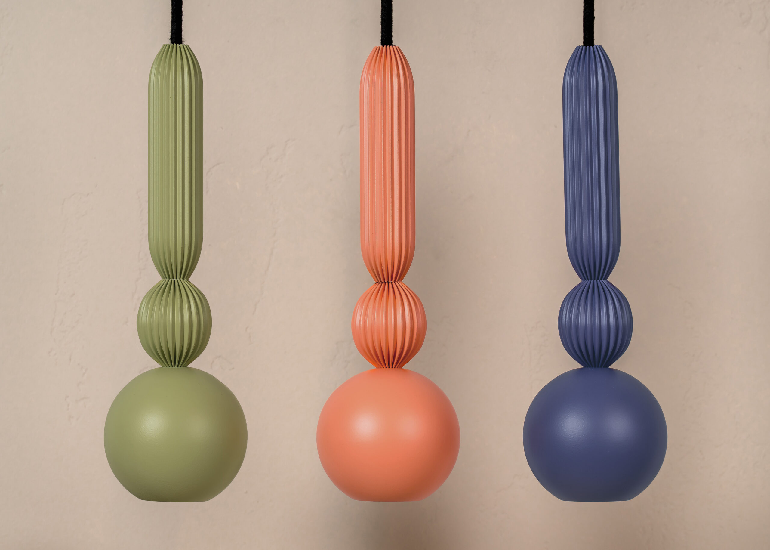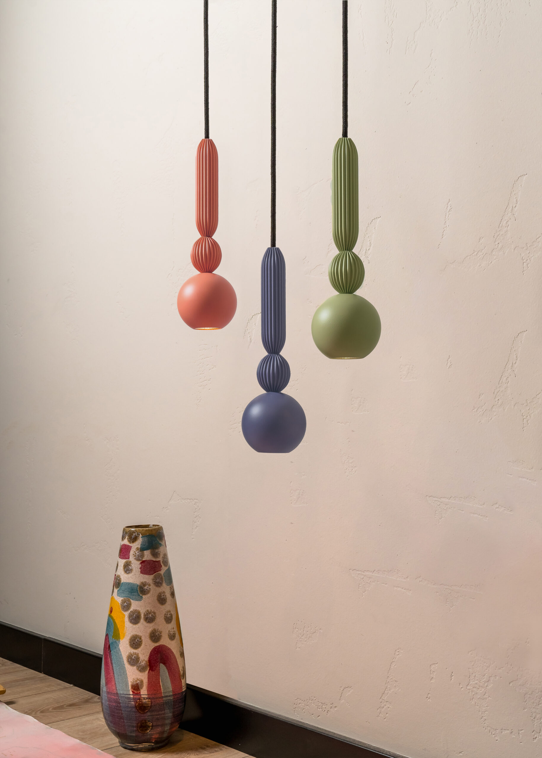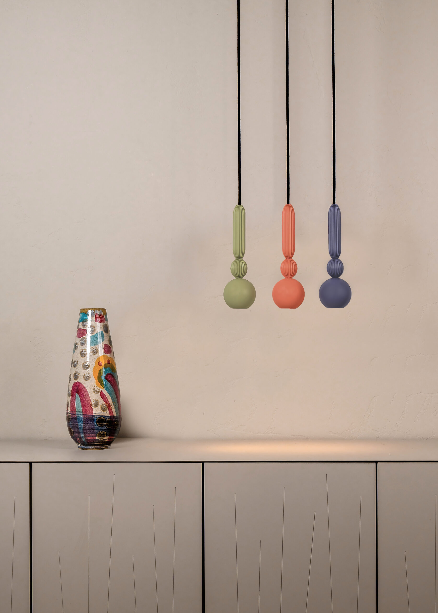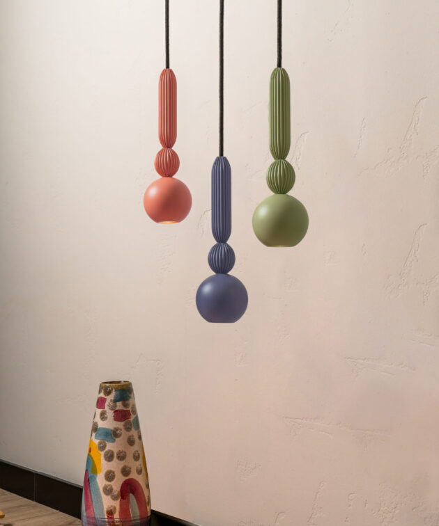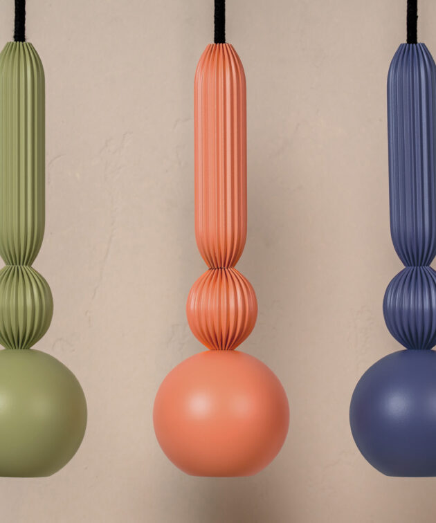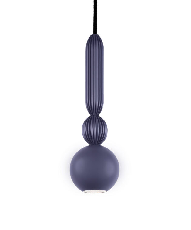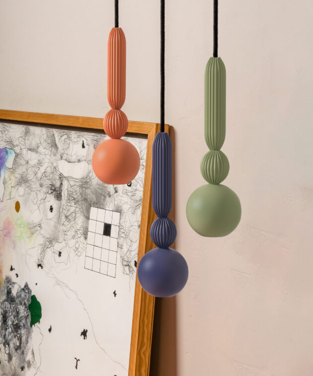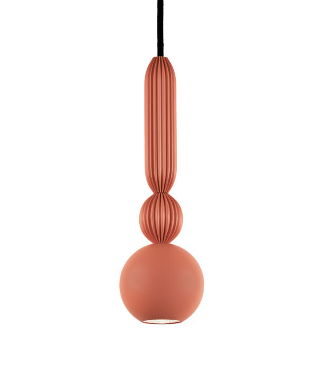 Bosca is a compact pendant lamp with a pure, geometric form. Its structure consists of a steel sphere with an integrated light source and two fluted rings – one smaller, one elongated – placed above. Both brass elements are powder-coated in a chosen colour, allowing them to match the shade or create a contrasting composition. The delicate fluted texture breaks the smoothness of the sphere, adding a subtle visual rhythm.