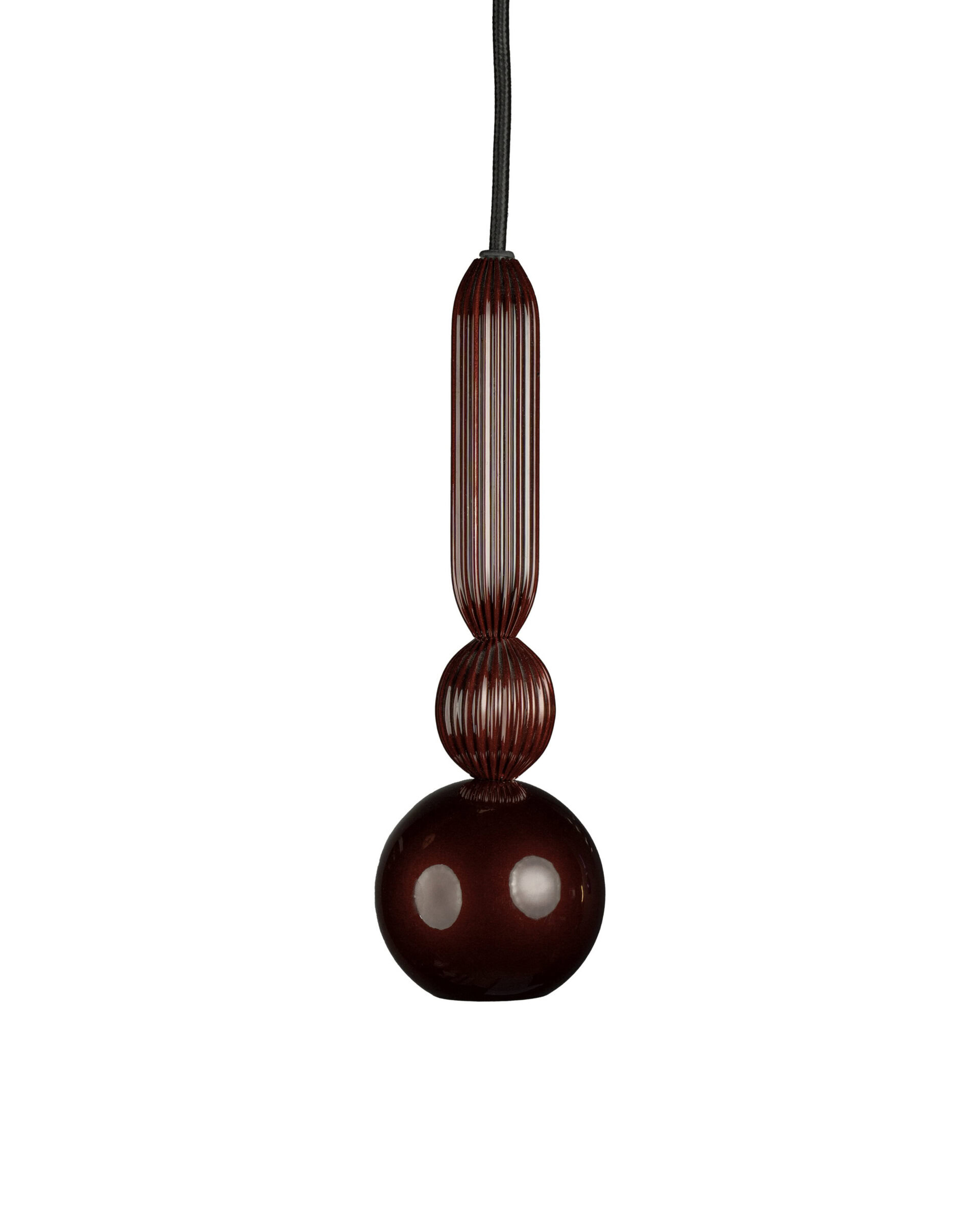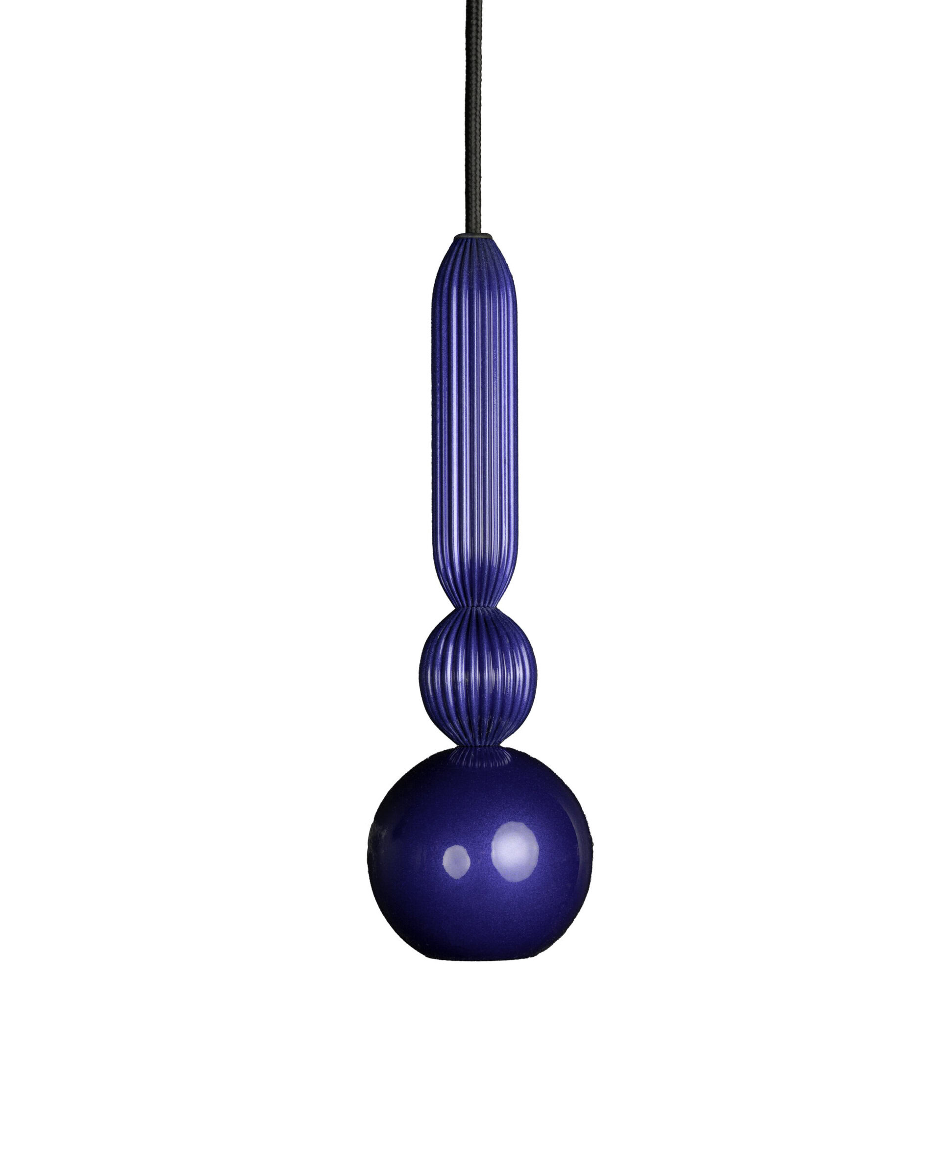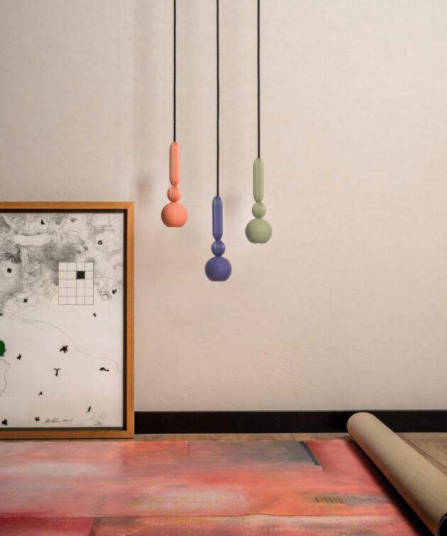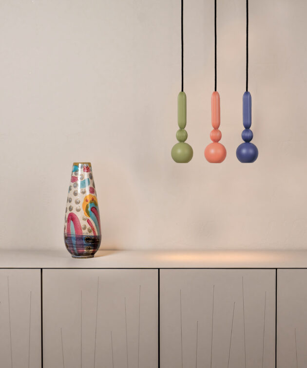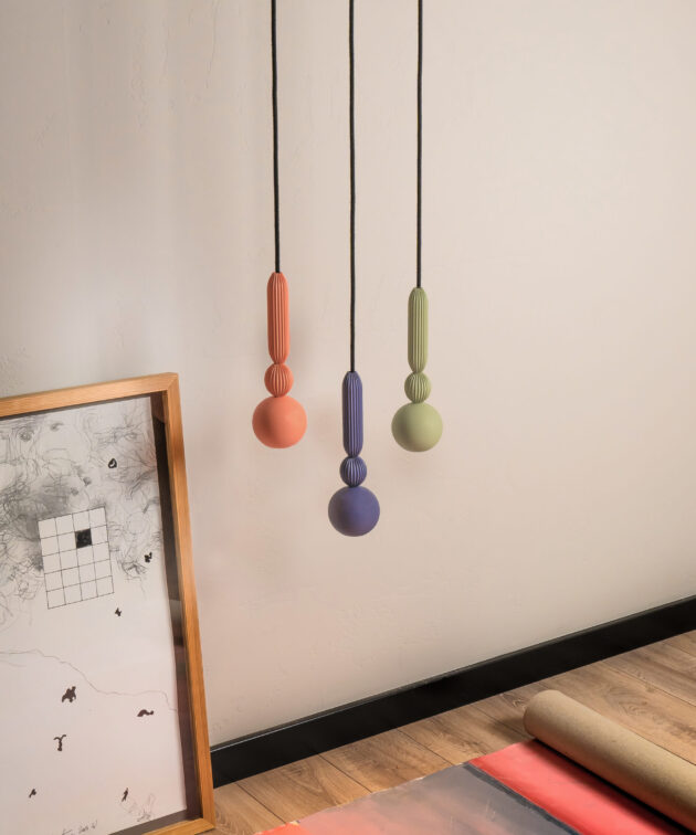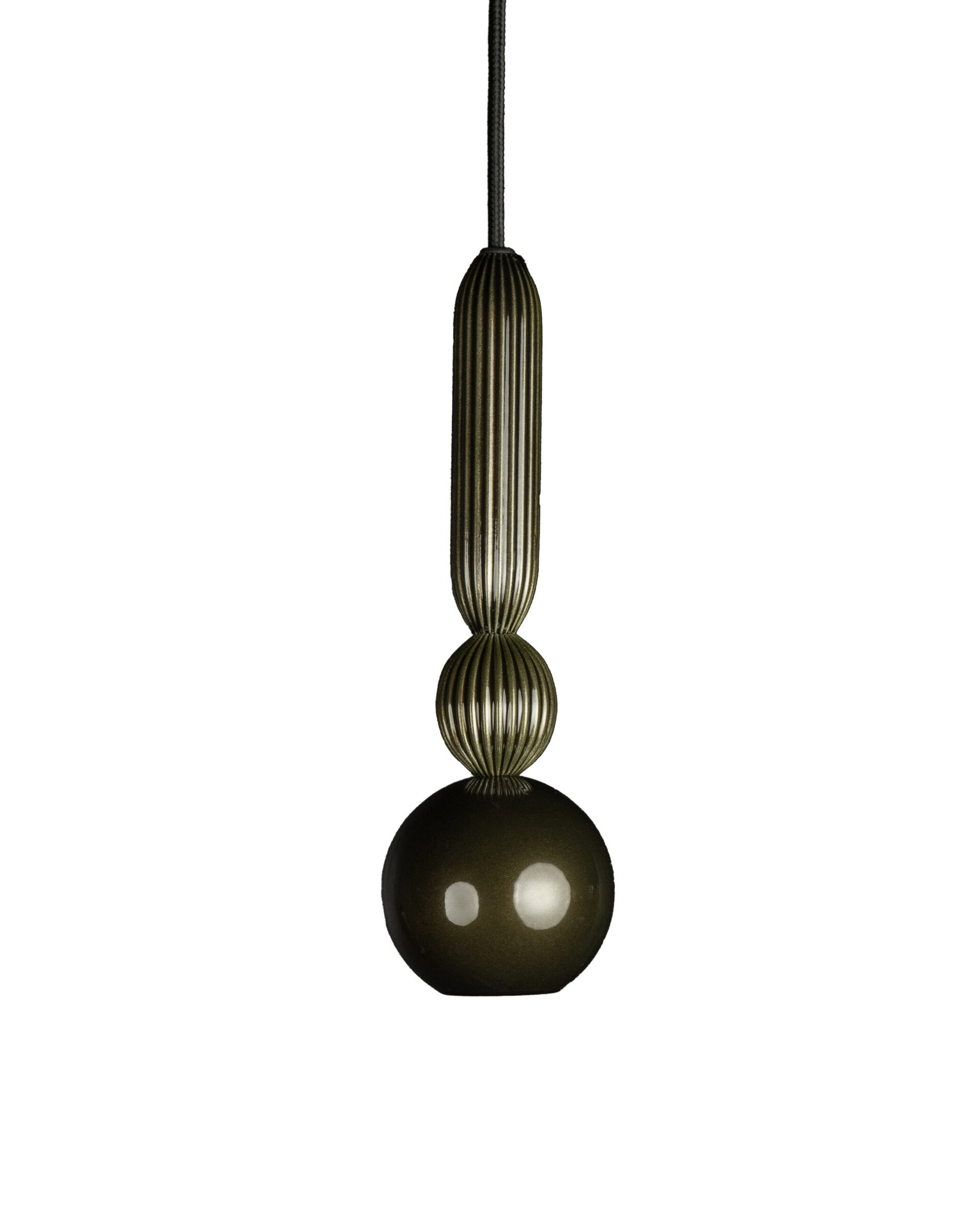 Bosca is a compact pendant lamp with a pure, geometric form. Its structure consists of a steel sphere with an integrated light source and two fluted rings – one smaller, one elongated – placed above. Both brass elements are powder-coated in a chosen colour, allowing them to match the shade or create a contrasting composition. The delicate fluted texture breaks the smoothness of the sphere, adding a subtle visual rhythm.