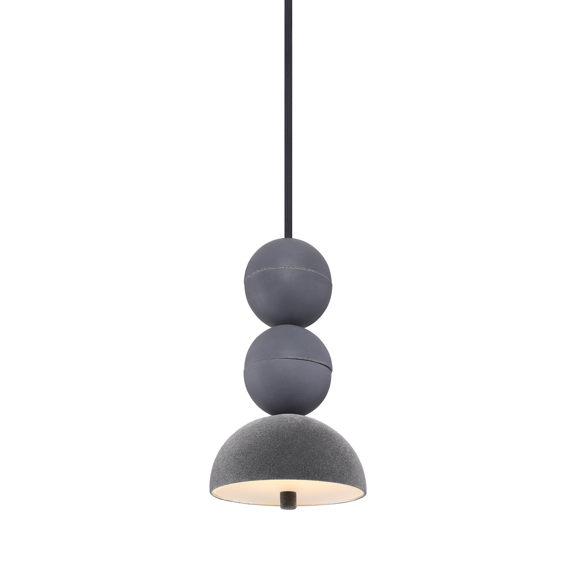 Bosfor Velvet is a contemporary pendant lamp that brings together contrasting materials and finishes. A smooth aluminium shade, finished with a tactile Velvet coating, is combined with hand-cast concrete spheres, giving each lamp a unique and unrepeatable character. The subtle texture of Velvet softens the raw form, making the design visually inviting. The model is available in two variants – with two or three spheres – as well as in multi configurations.