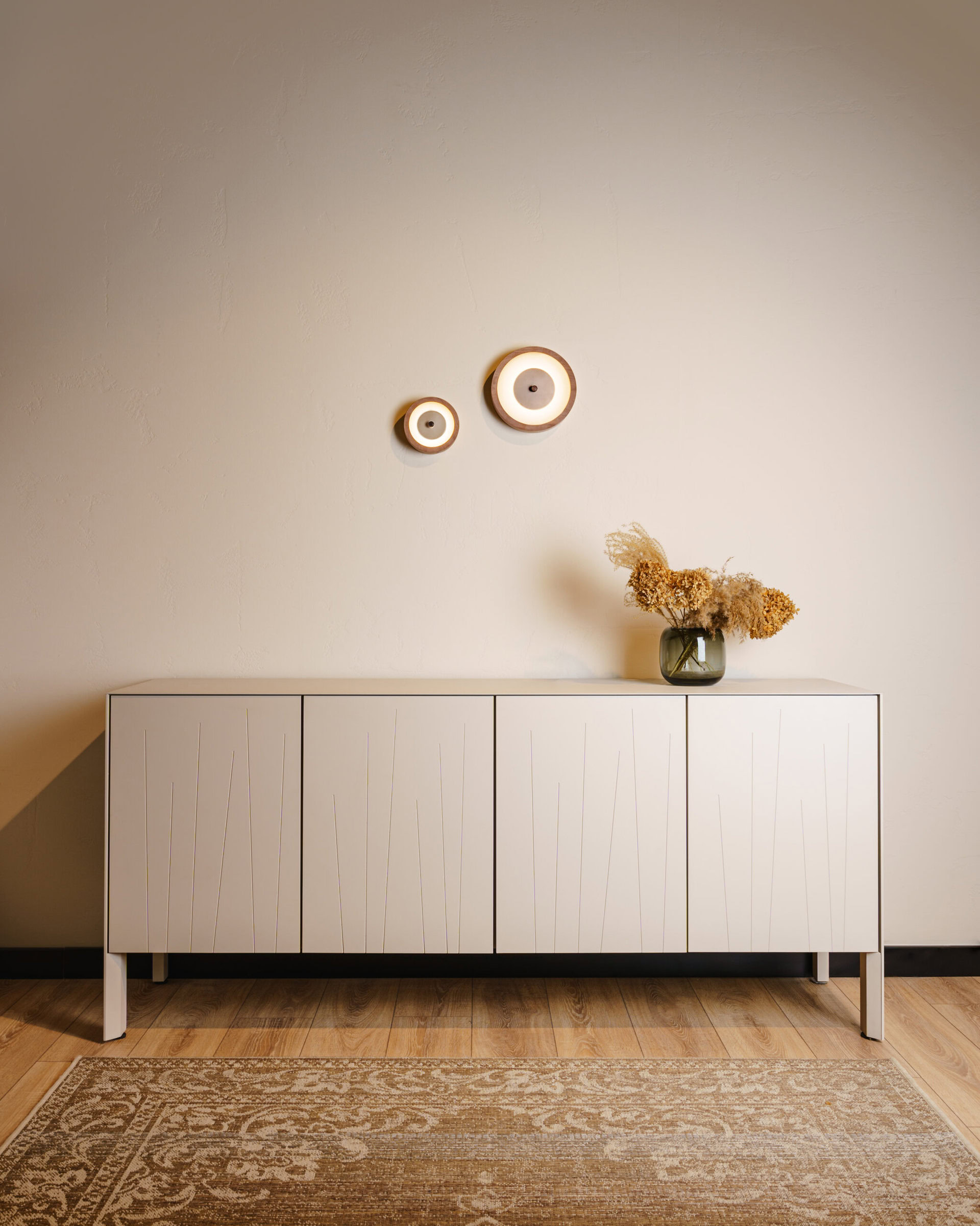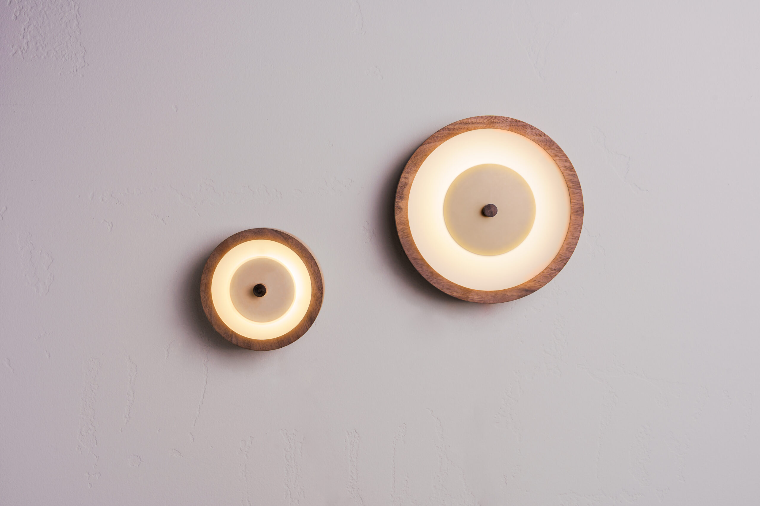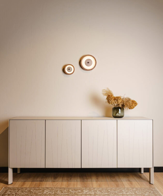 Bugie is a minimalist wall lamp that combines a technical core with a natural accent. Its construction consists of a central powder-coated aluminium circle, framed with solid American walnut wood and finished with frosted glass. Compact in form and providing soft, diffused light, Bugie is an ideal choice for relaxation areas, corridors, and modern wall arrangements.