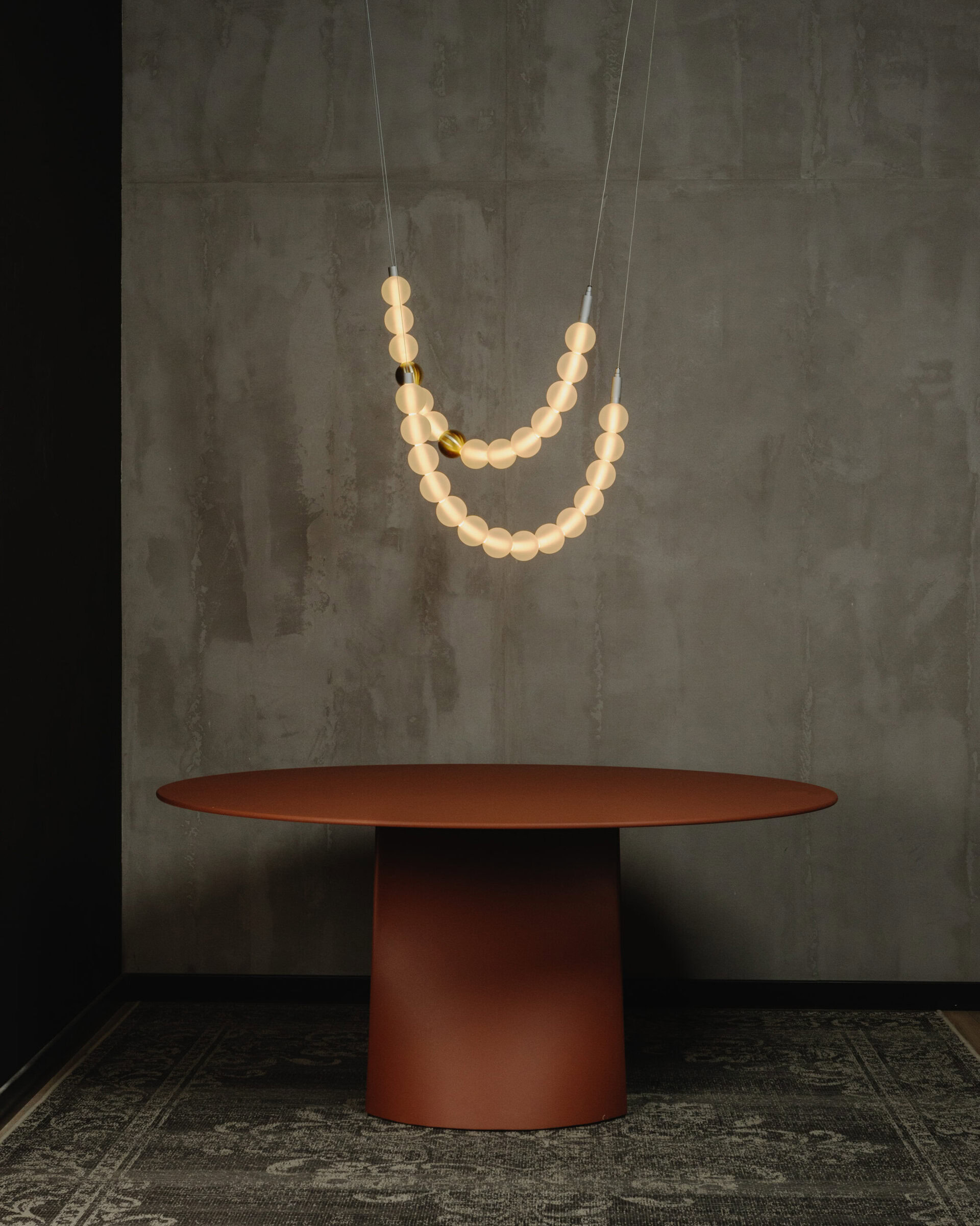 Daisy 710 is a modern pendant lamp inspired by the silhouette of Daisy von Pless’s pearl necklace. A flexible LED tube, wrapped with fourteen frosted glass spheres (Ø 7 cm), creates a dynamic yet subtle rhythm of light. It is designed for interiors where a lamp should be both functional and decorative – elegant, but never excessive.