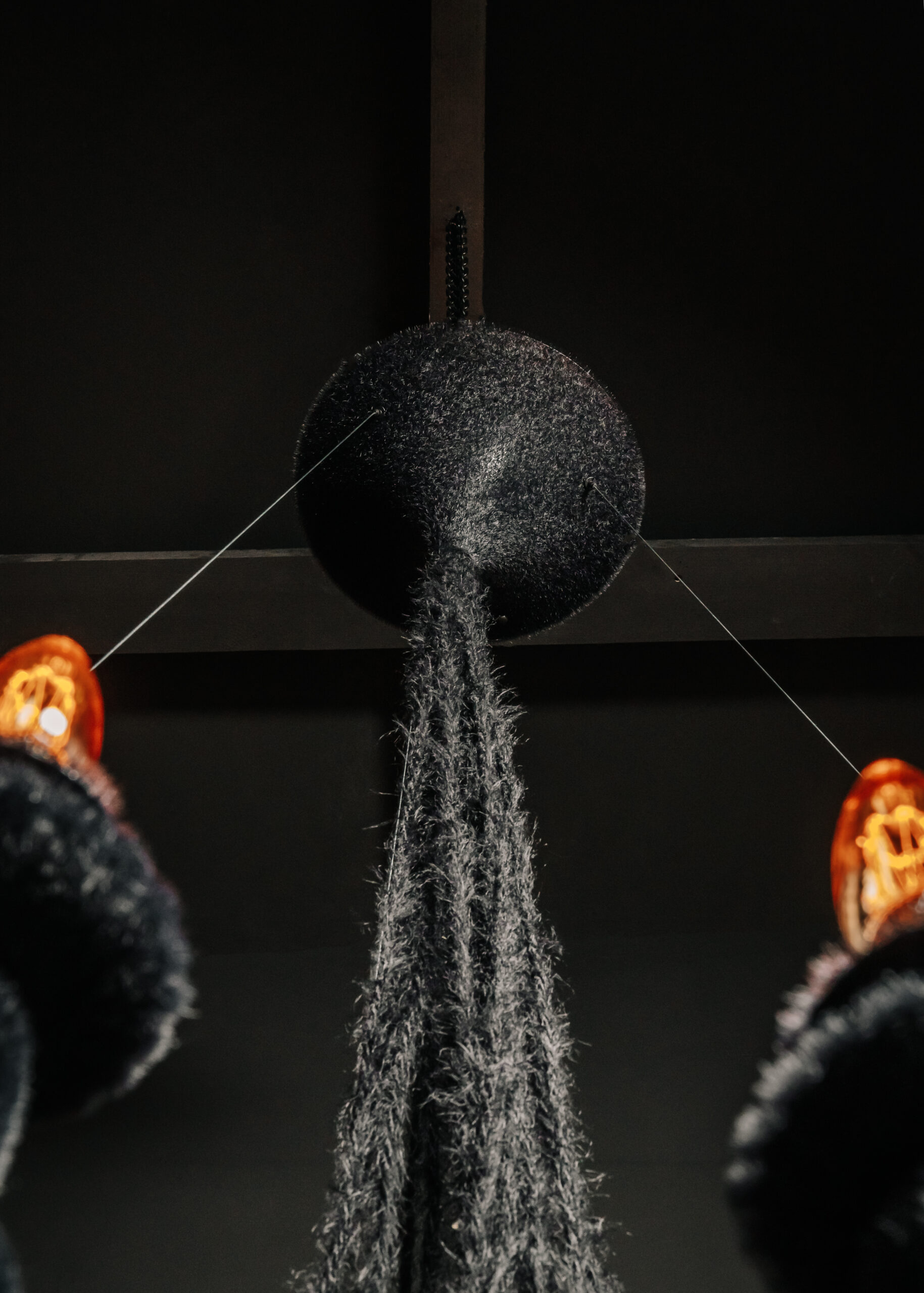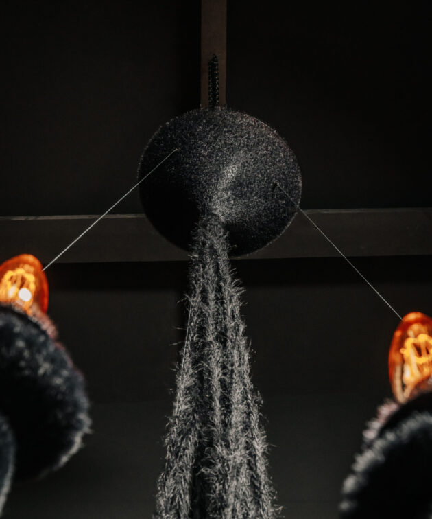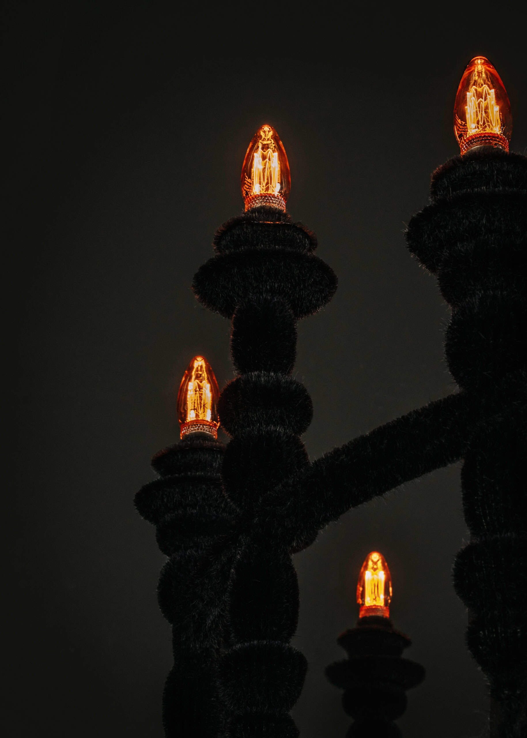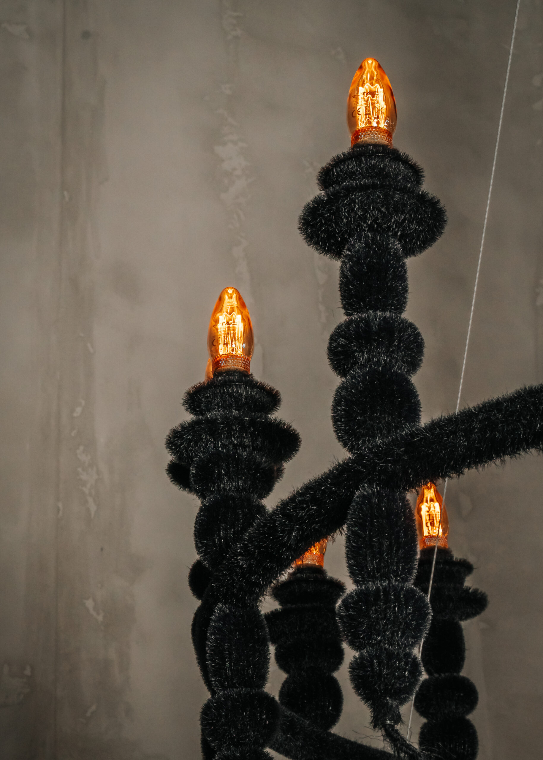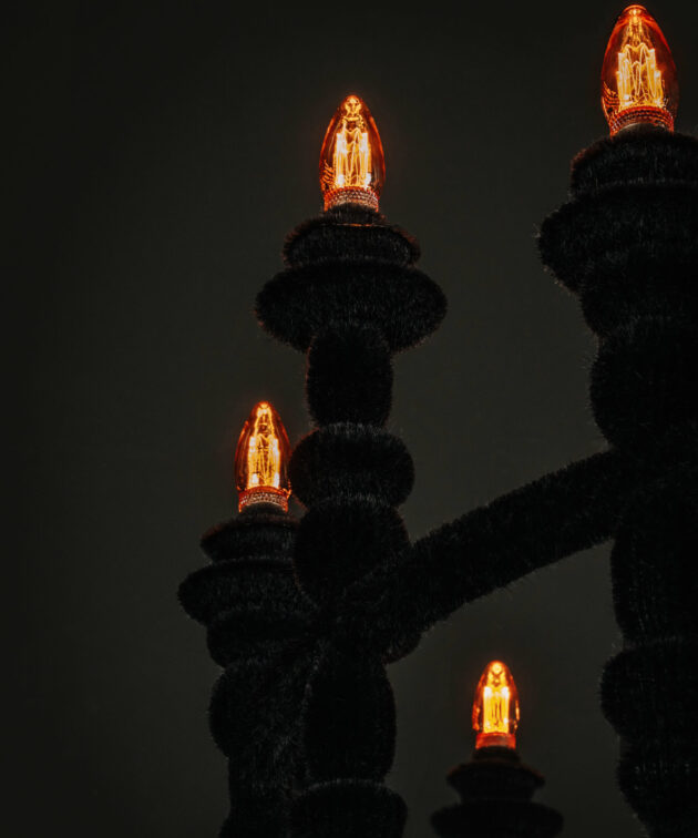 The Dracula Chandelier is a statement piece that does more than illuminate – it defines the space. Its monumental form, covered with a long-pile velvet texture, captures attention and introduces an atmosphere of mysterious elegance. Inspired by theatrical gestures and baroque ornamentation, the lamp combines aluminium, steel, and brass into a sculptural structure that hovers in the air like a stage prop. This is a fixture created for interiors that aim to impress.