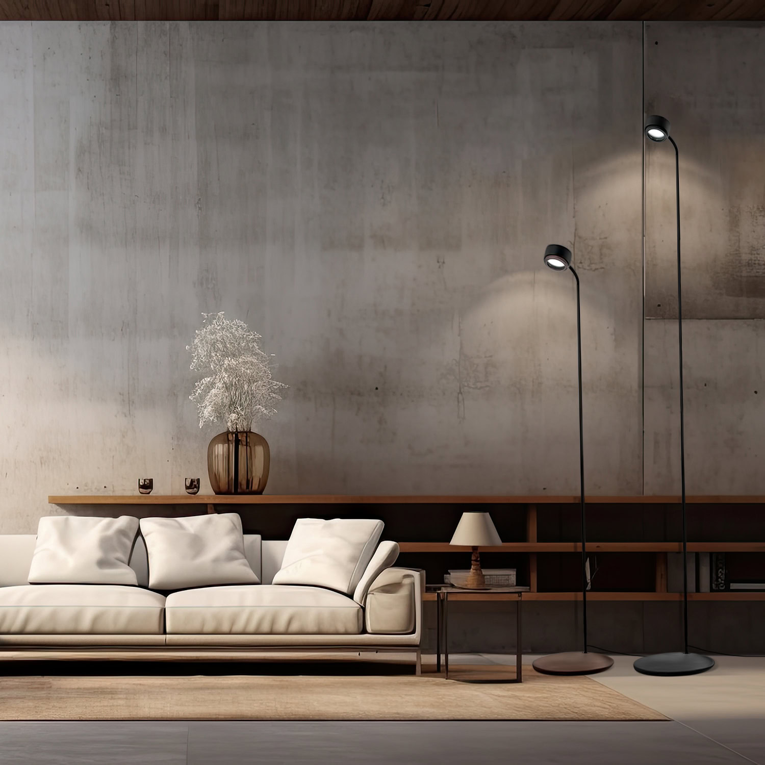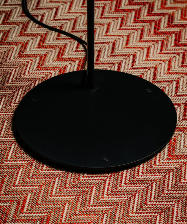 Jubi Wood is a floor lamp that combines a minimalist construction with the warmth of solid wood. The body is made of powder-coated aluminium and steel in matte black, while the lower part of the shade is crafted from raw American walnut. This contrast of materials gives the lamp a distinctive yet subtle character – ideal for modern, elegant interiors.