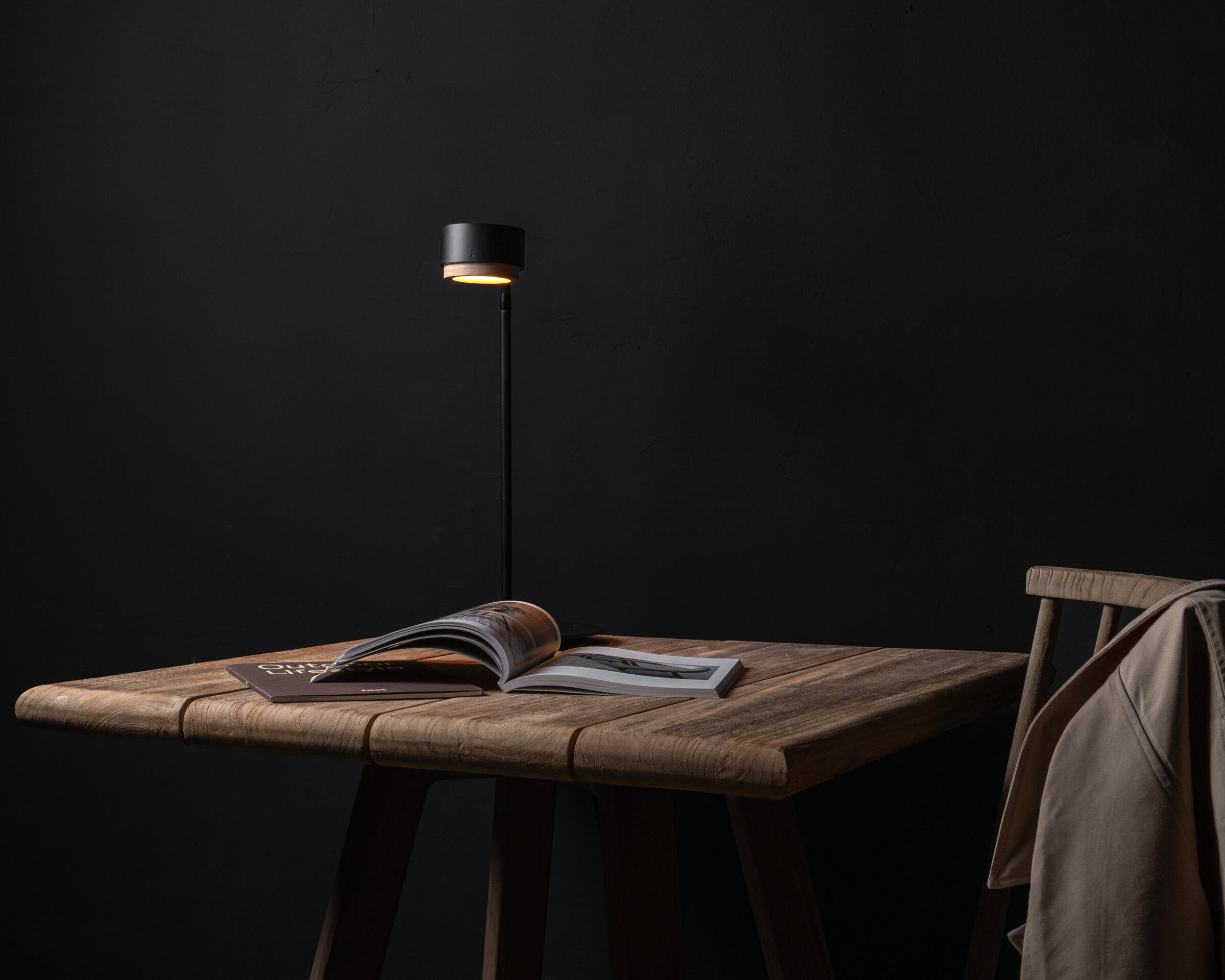 Compact form. Black aluminium. Subtle walnut accent.