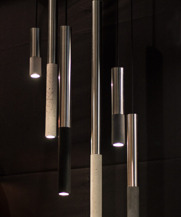 Kalla Inox is a series of slim cylindrical pendant lamps that combine hand-cast concrete with stainless steel details. With a narrow diameter of only 5.5 cm and a wide range of heights, they allow for spectacular lighting compositions – from subtle single pendants to dynamic multi-point installations. Kalla Inox fits seamlessly into modern interiors, offering an industrial rawness balanced with precision and elegance.