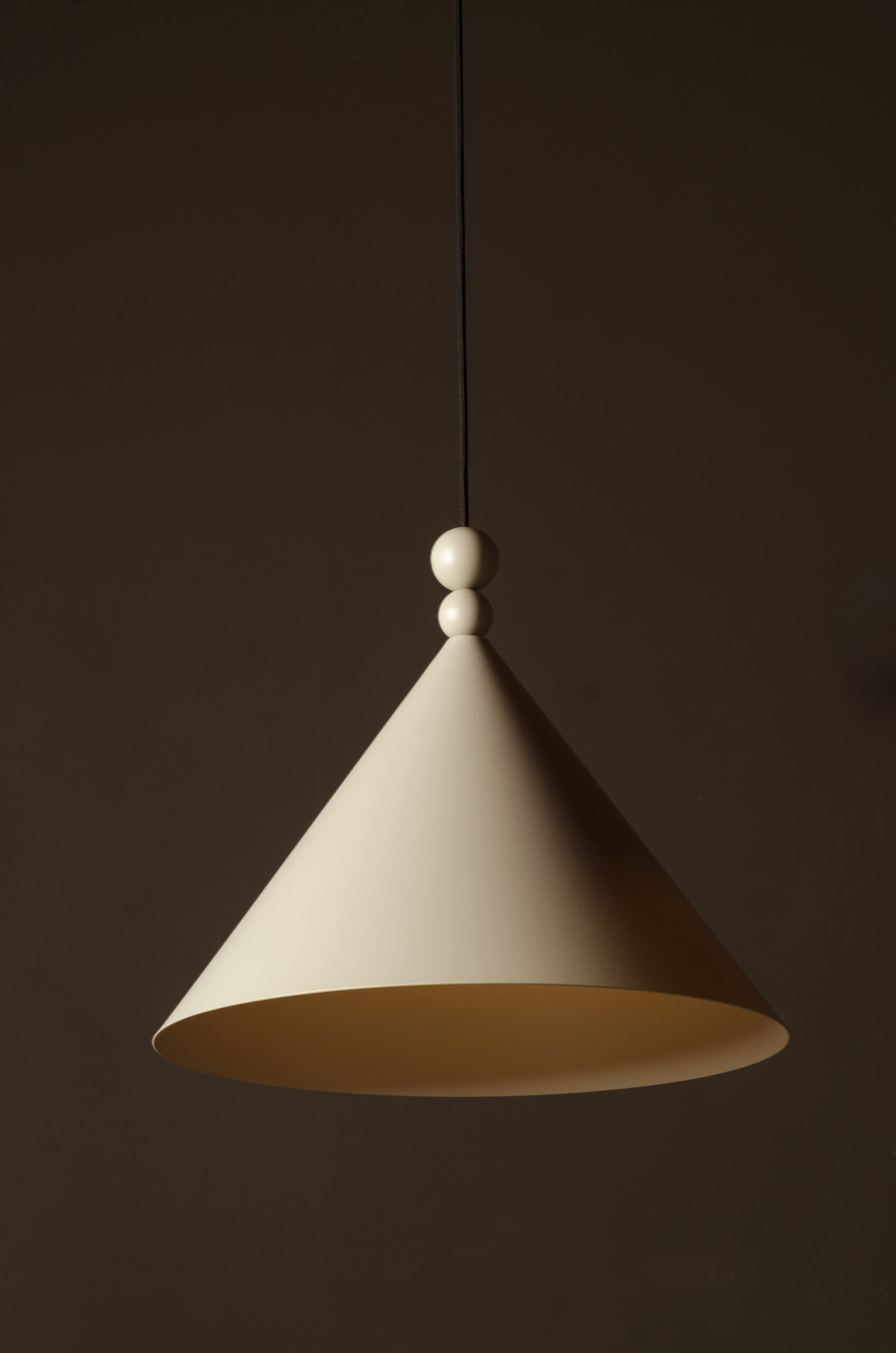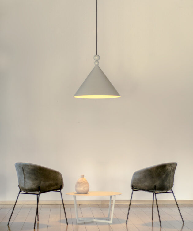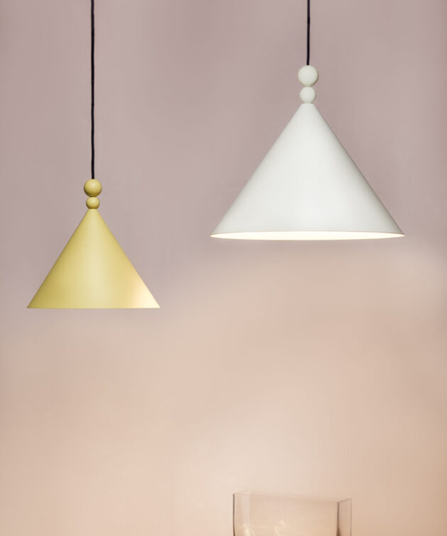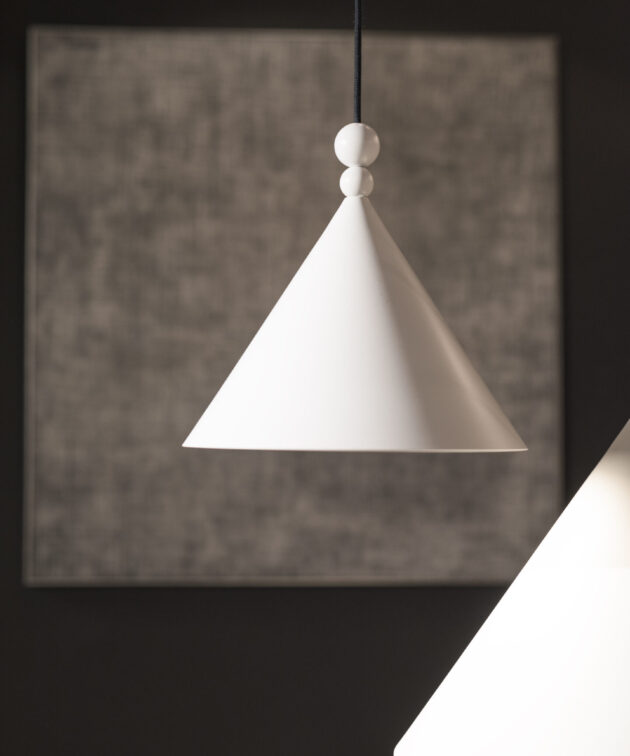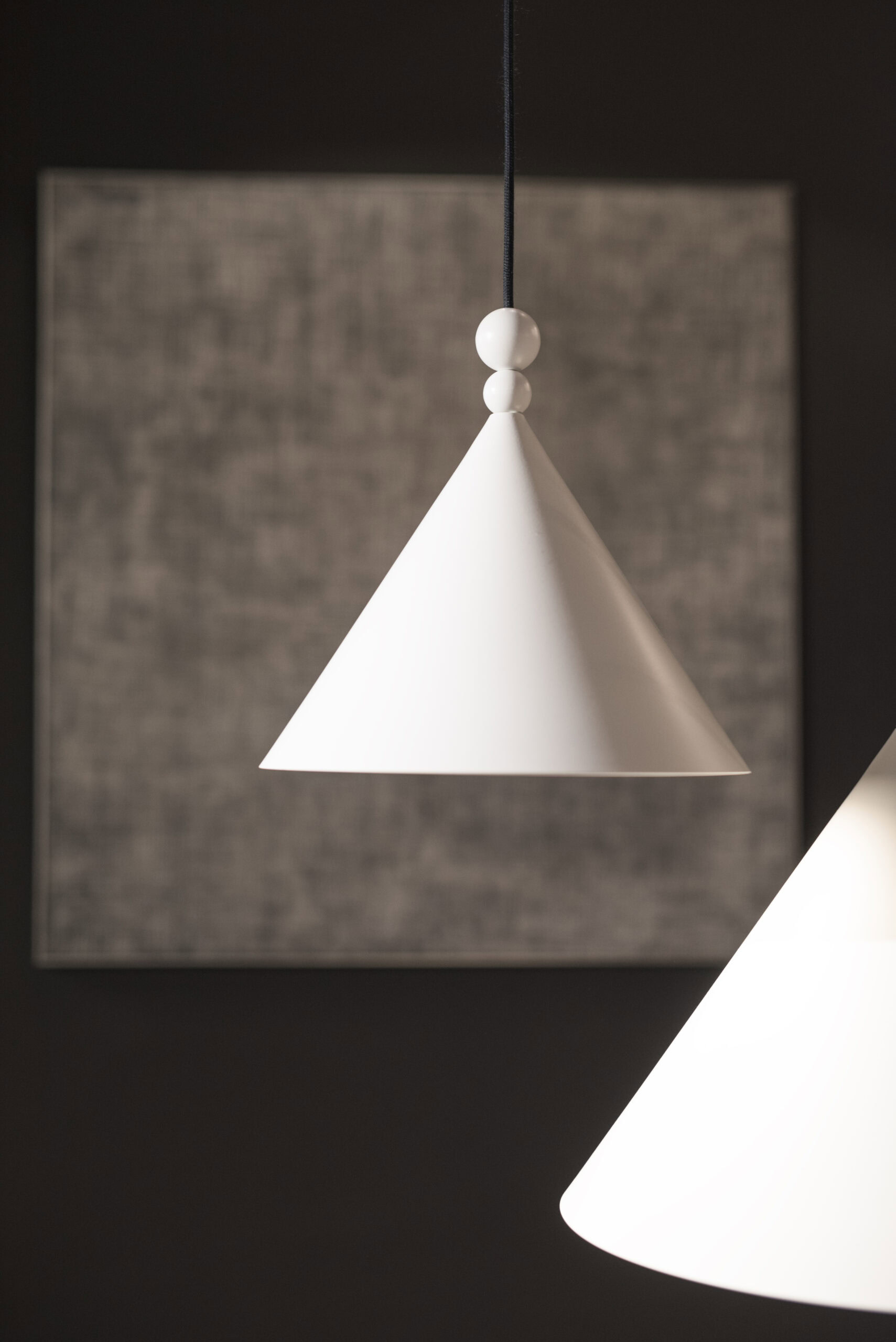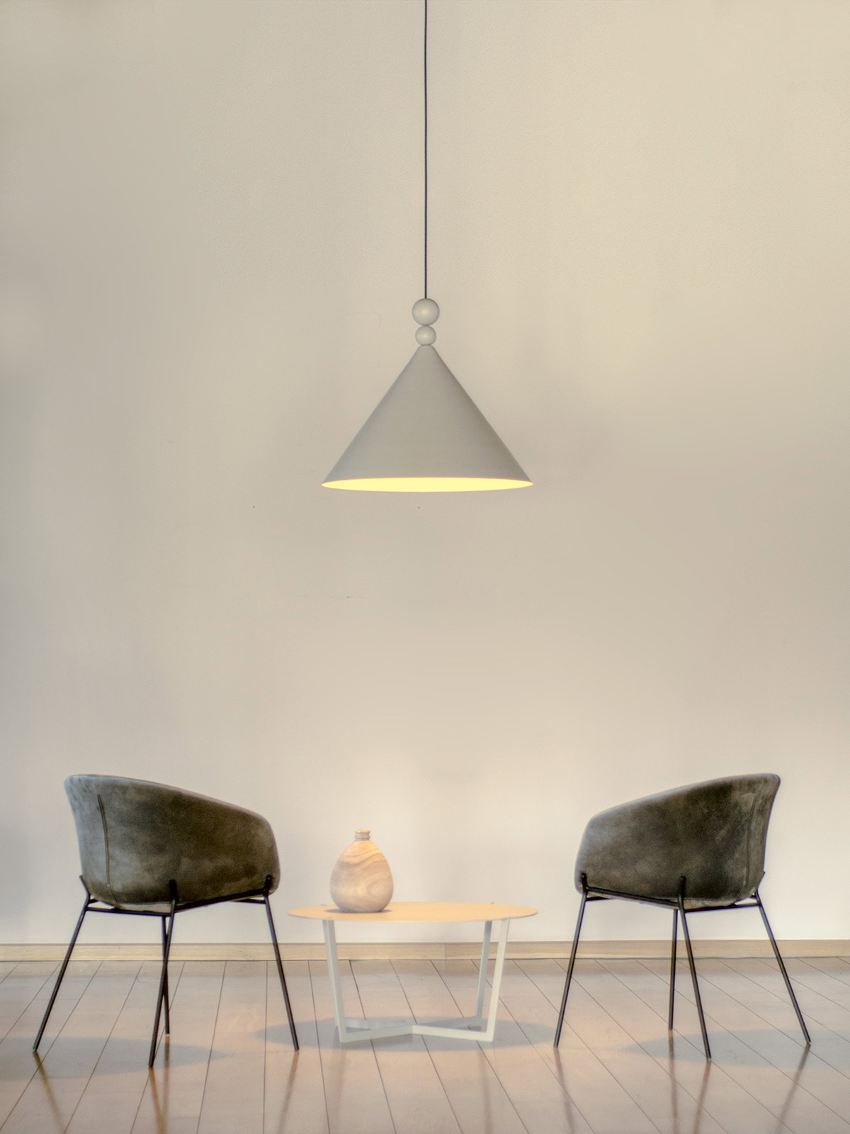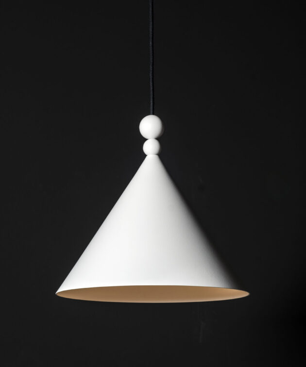 Konko is a pendant lamp that combines a minimalist conical shade with a subtle yet distinctive accent – two spherical elements placed above the lampshade. This characteristic feature gives the lamp its recognisable rhythm and balances its form. Made entirely of powder-coated aluminium and available in four sizes, Konko works beautifully as a single piece or in group arrangements. The design was recognised with the must have 2020 award at Łódź Design Festival.