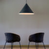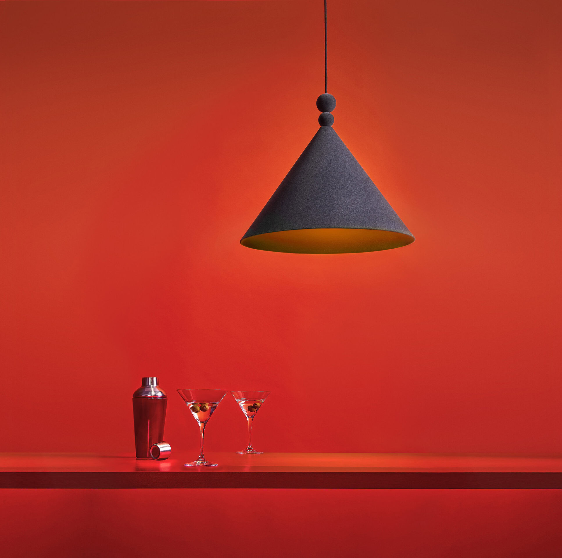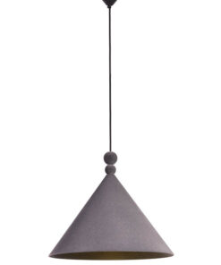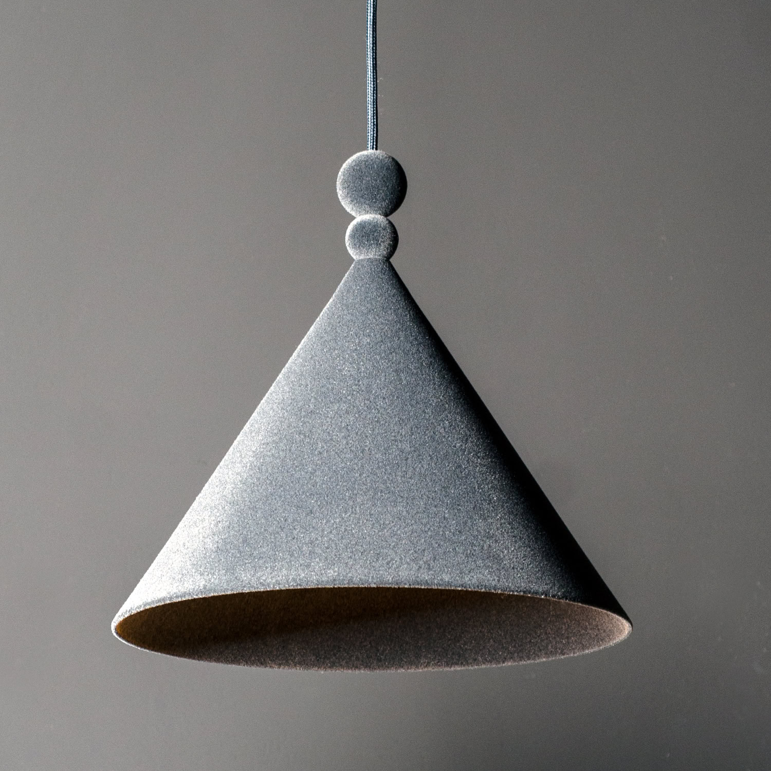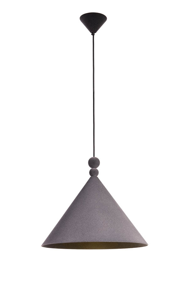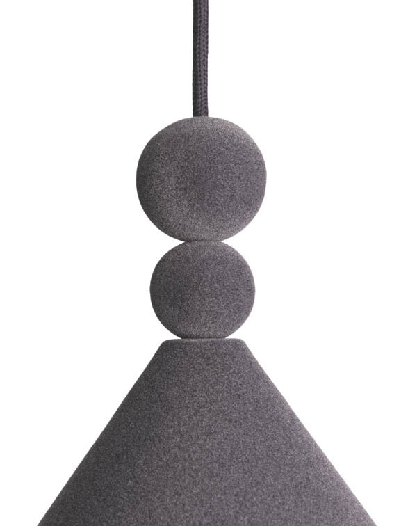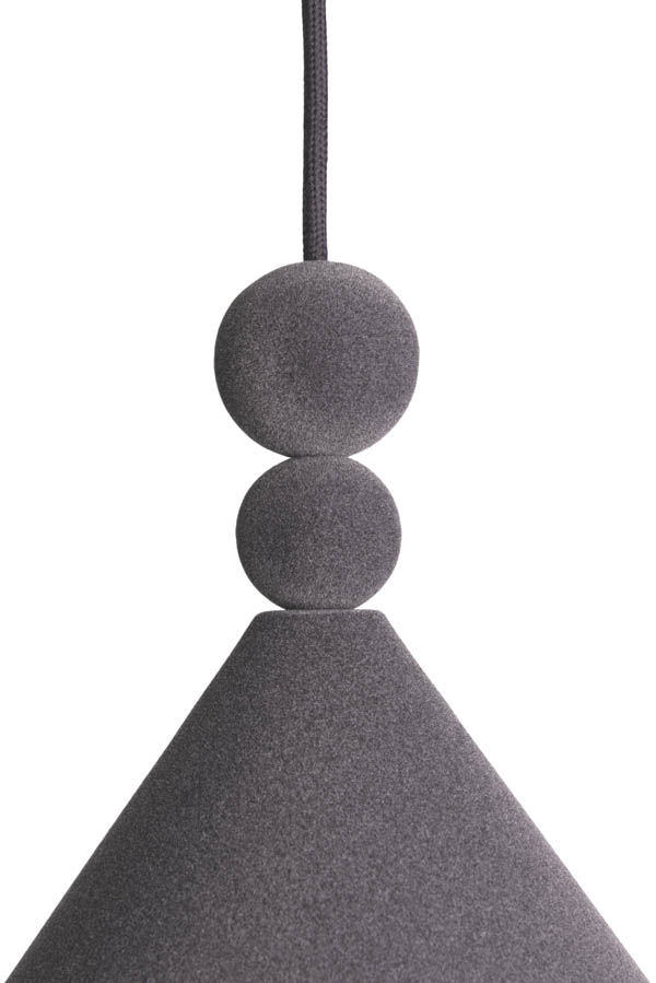 Konko Velvet is a modern pendant lamp where the classic conical shape is redefined by a velvet finish. Two distinctive spherical details above the shade – one smaller, one larger – add balanced elegance to the design. The shade, ceiling rose, and decorative spheres are all coated in the same velvet texture, creating a seamless matte surface with a soft, tactile character.