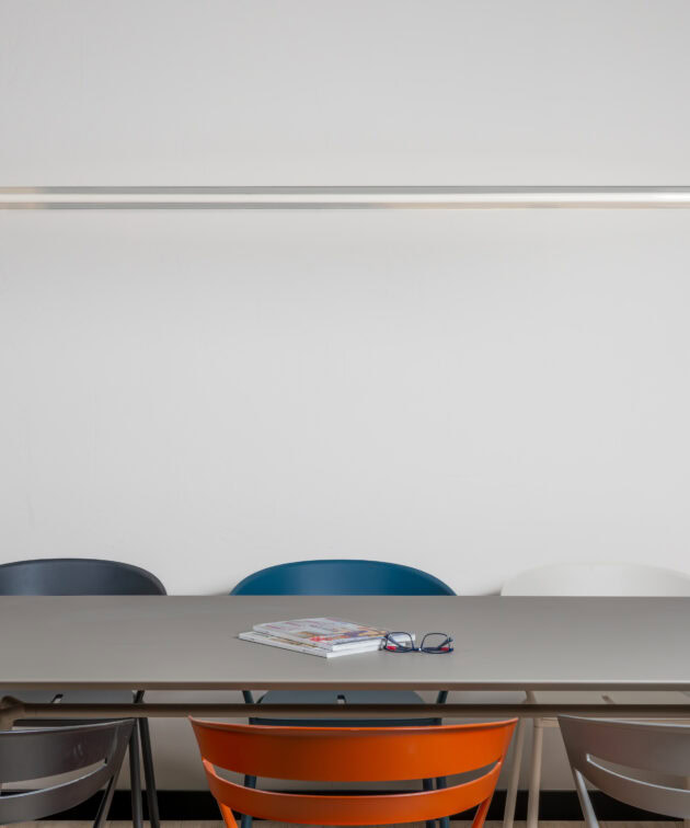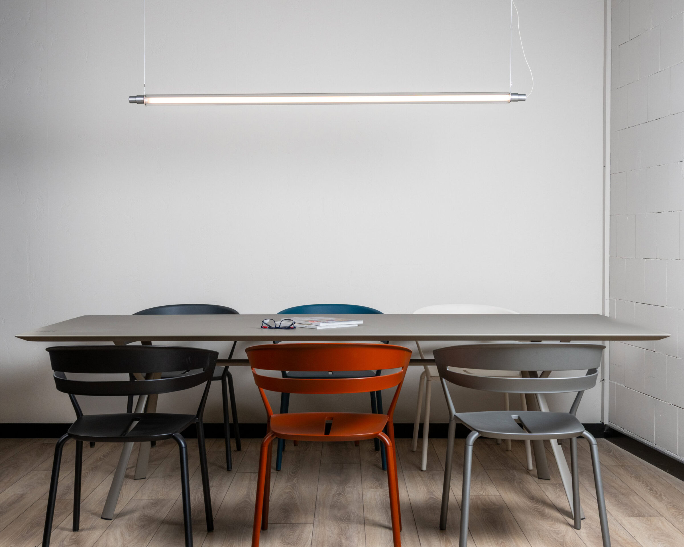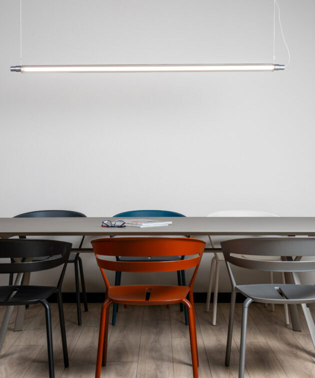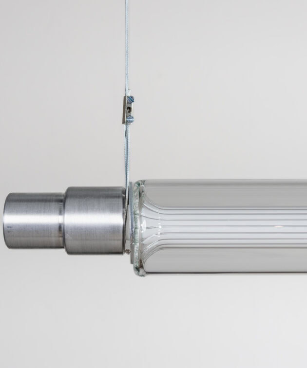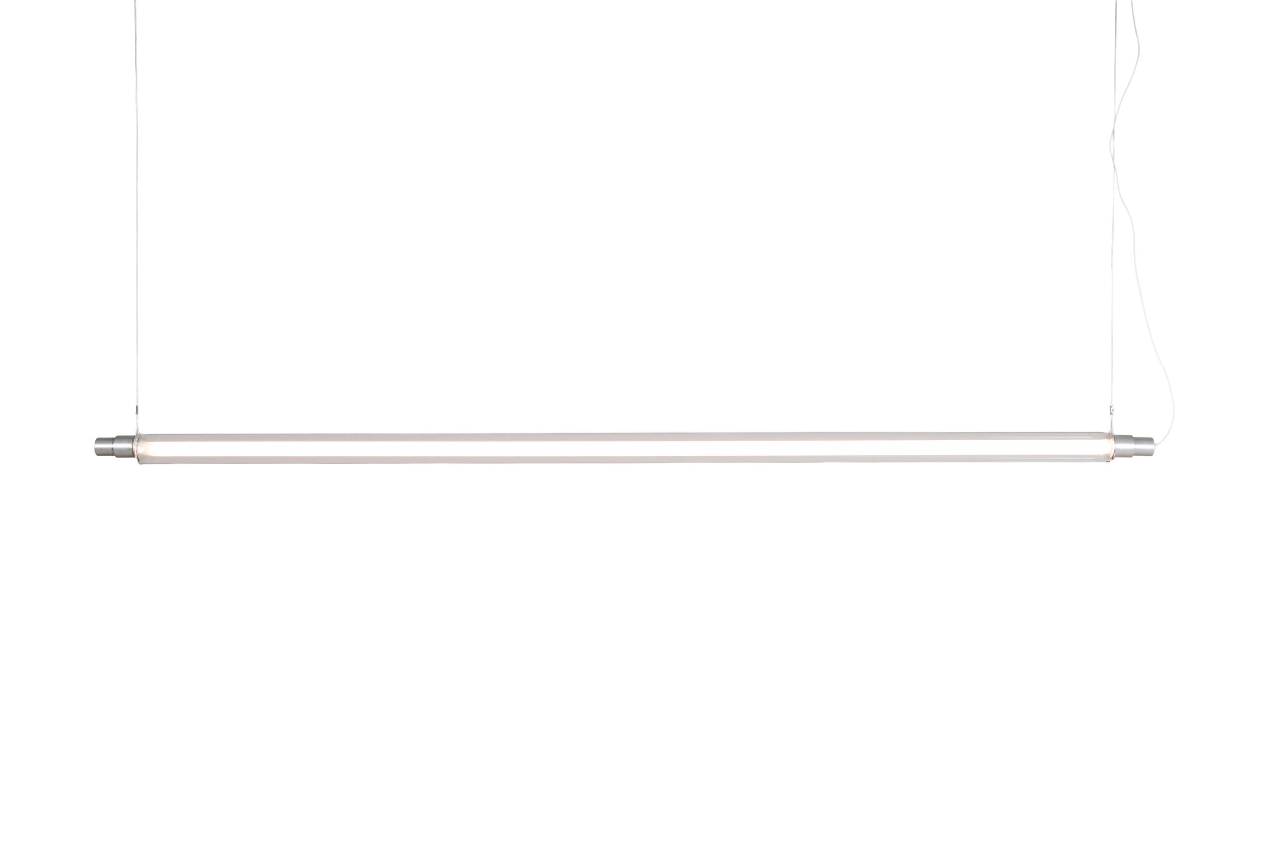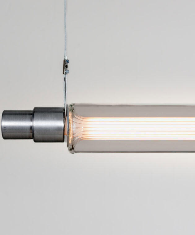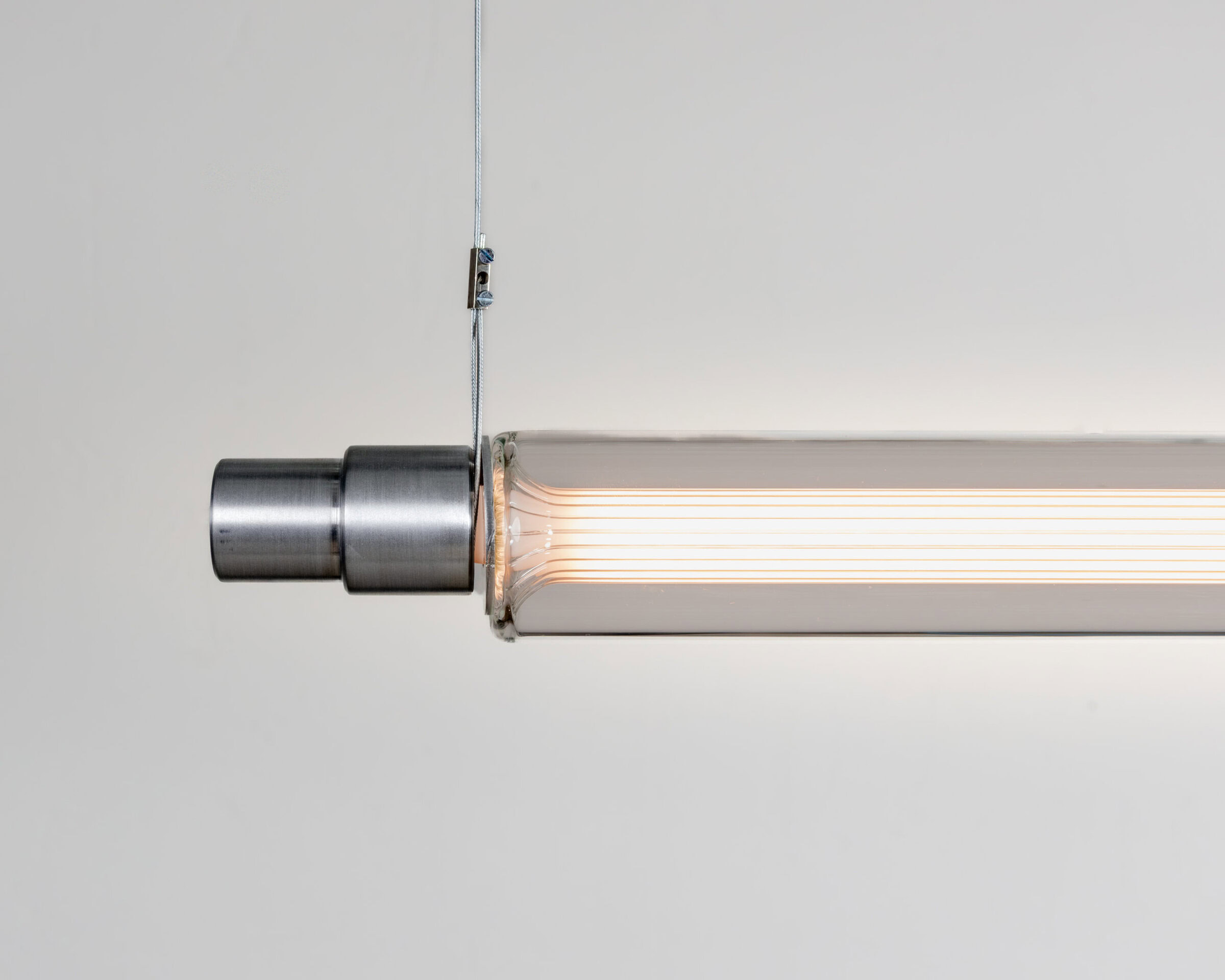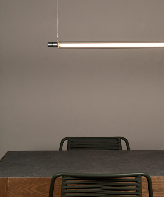 Solid aluminium end caps complete the composition, emphasising precision and the minimalist character of the fixture.