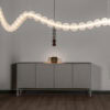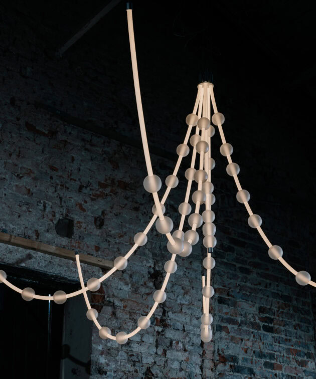 Mariska is a spectacular pendant lamp that captivates with its elegant combination of white, flexible LED tubes and subtle frosted glass spheres. Its form evokes the grandeur of classic chandeliers, yet it is crafted from modern materials and shaped by contemporary minimalism. Inspired by Mariska – an aristocrat connected to Prince von Pless – the lamp radiates lightness and a romantic aura.