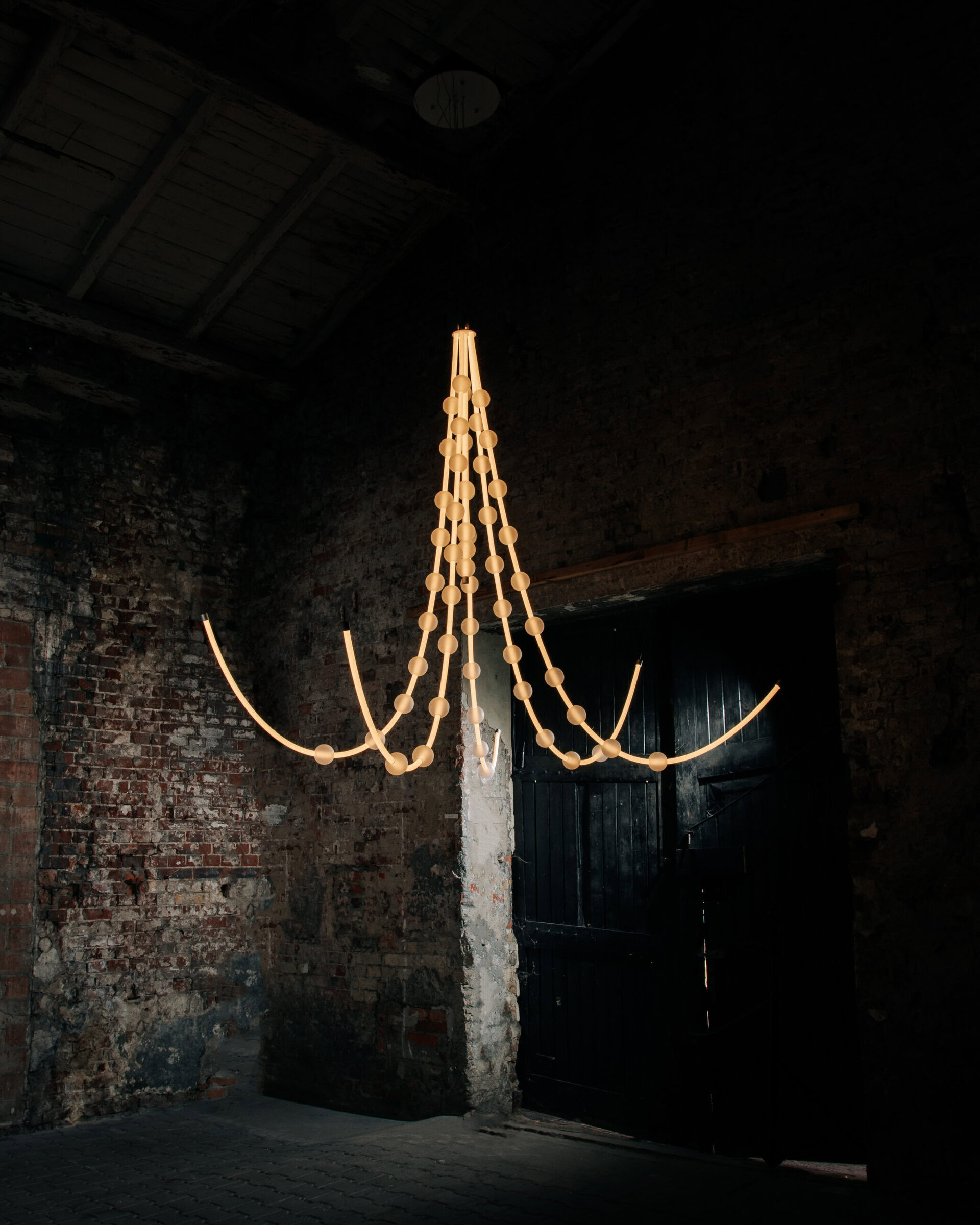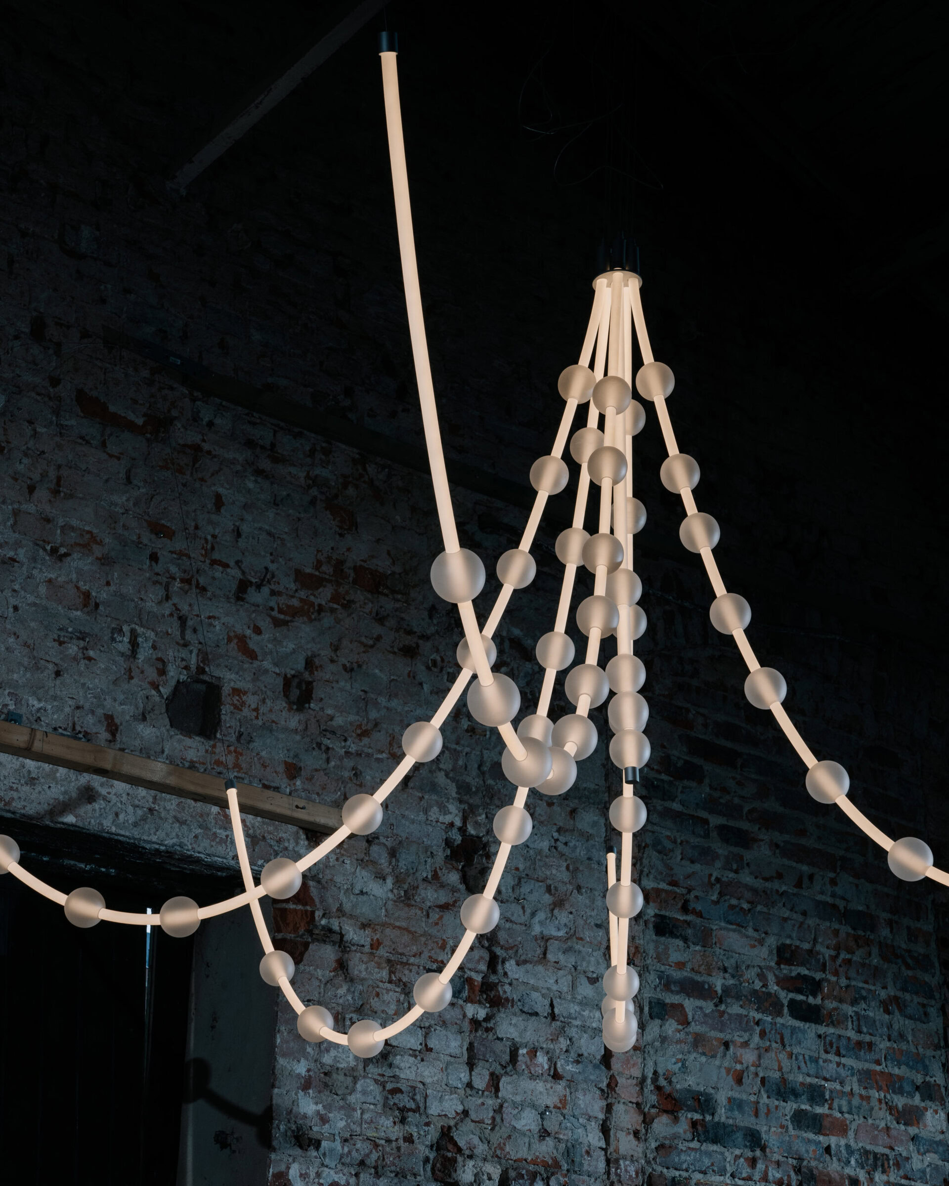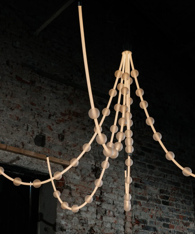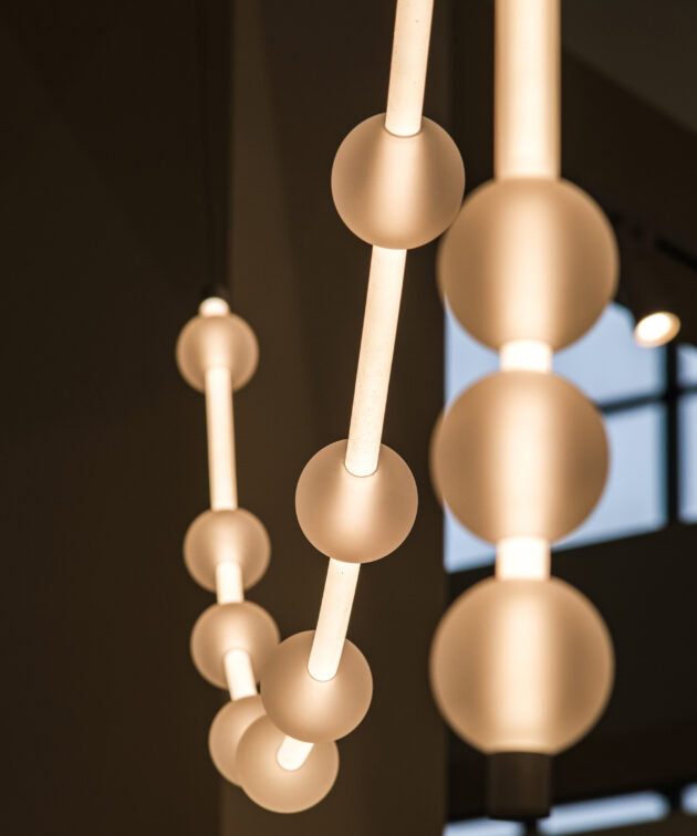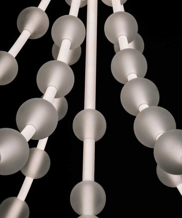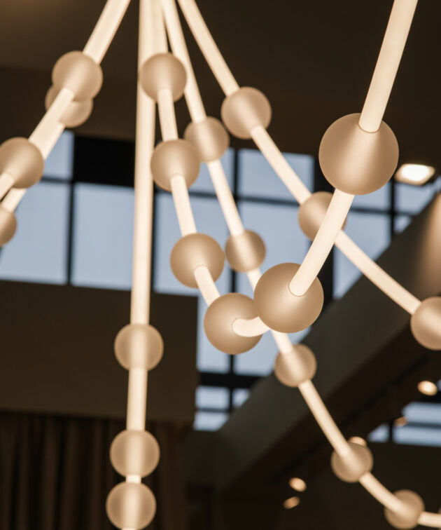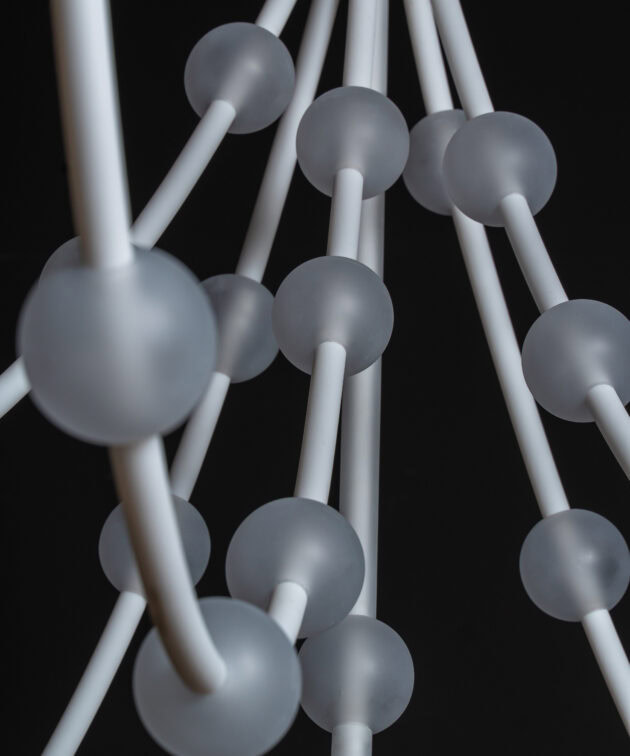 Each arm of the lamp can be freely arranged, while the glass spheres can be moved along the tubes, allowing the composition to be adapted to the interior. Perfect for tall spaces – whether residential or commercial – Mariska creates a breathtaking focal point.