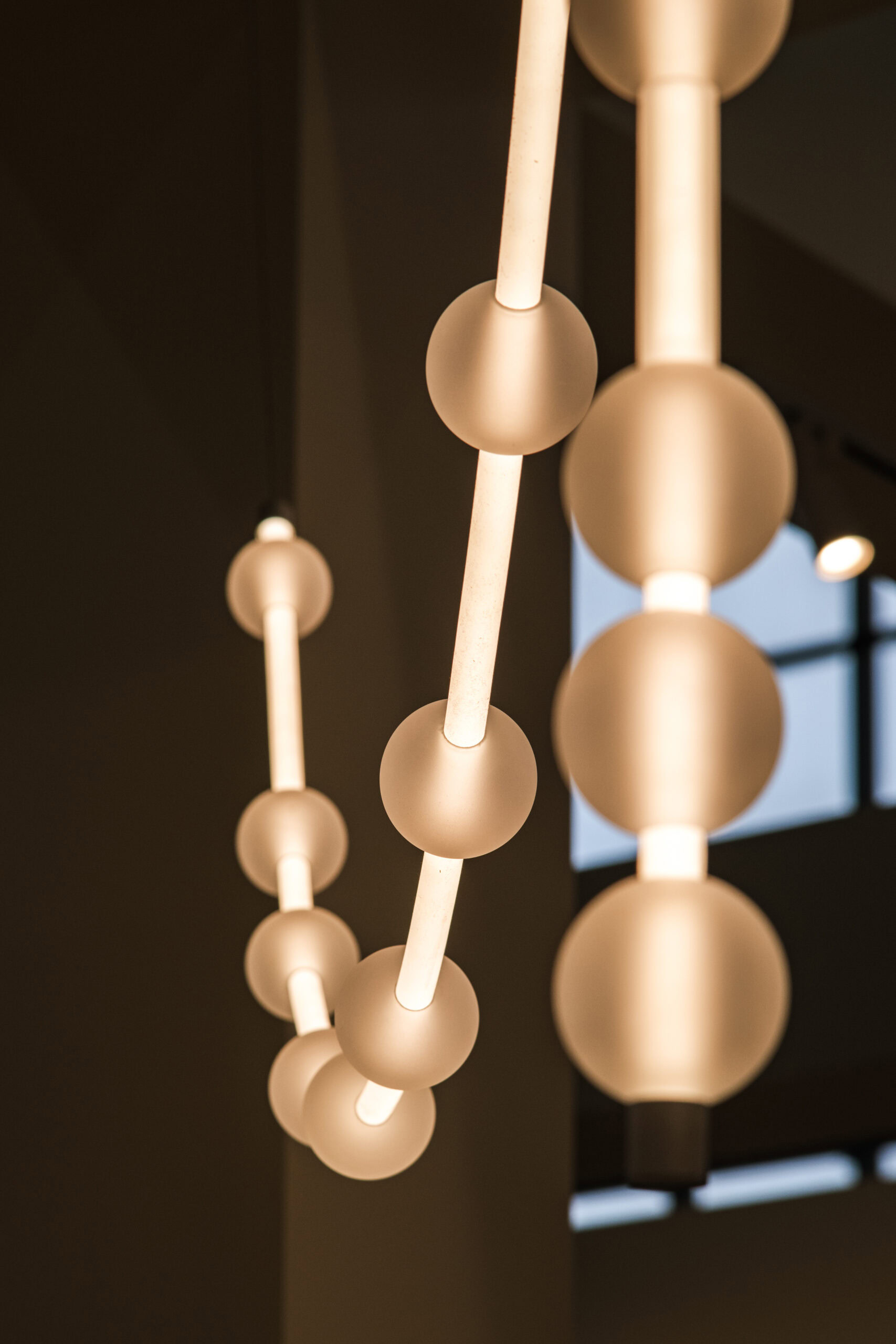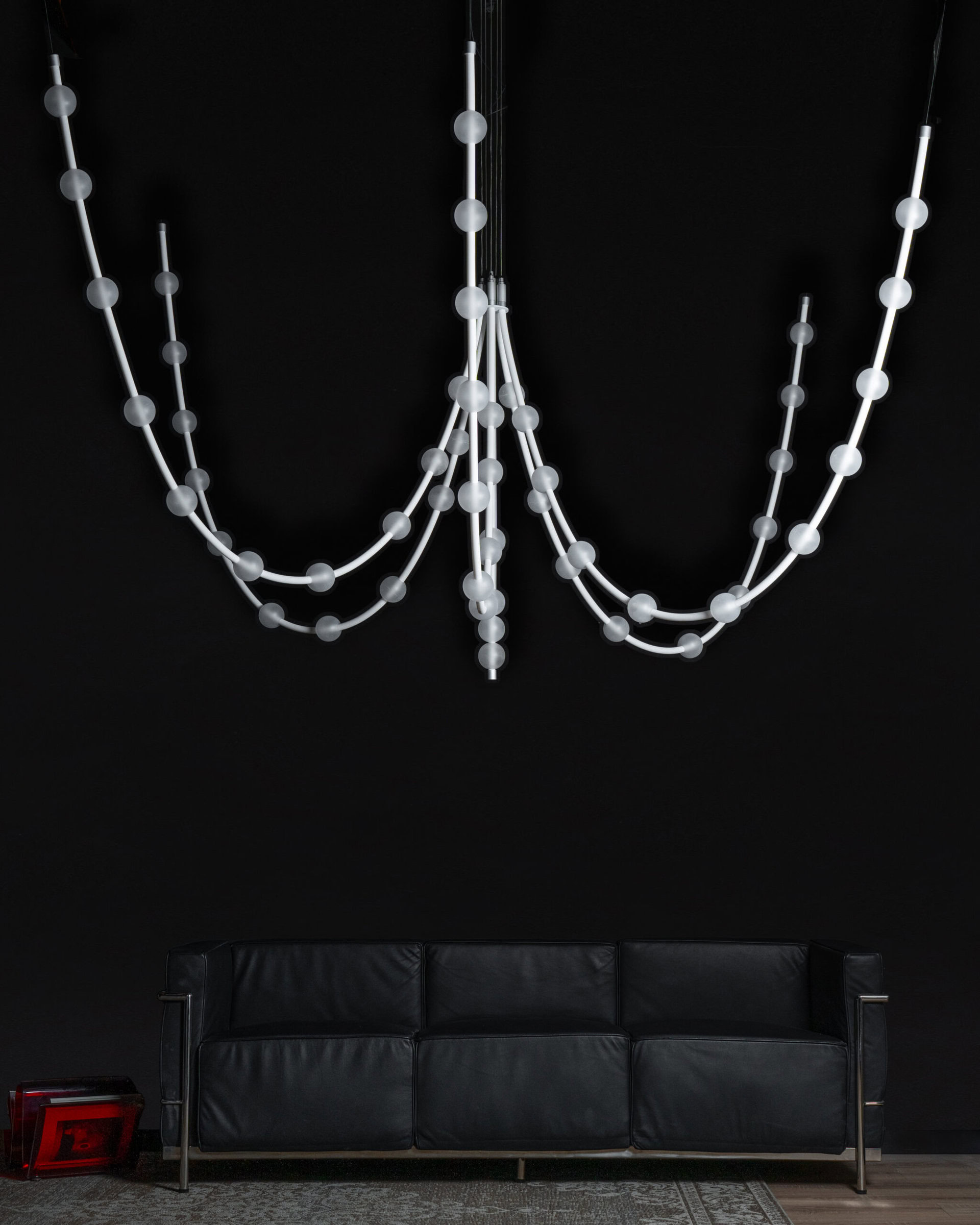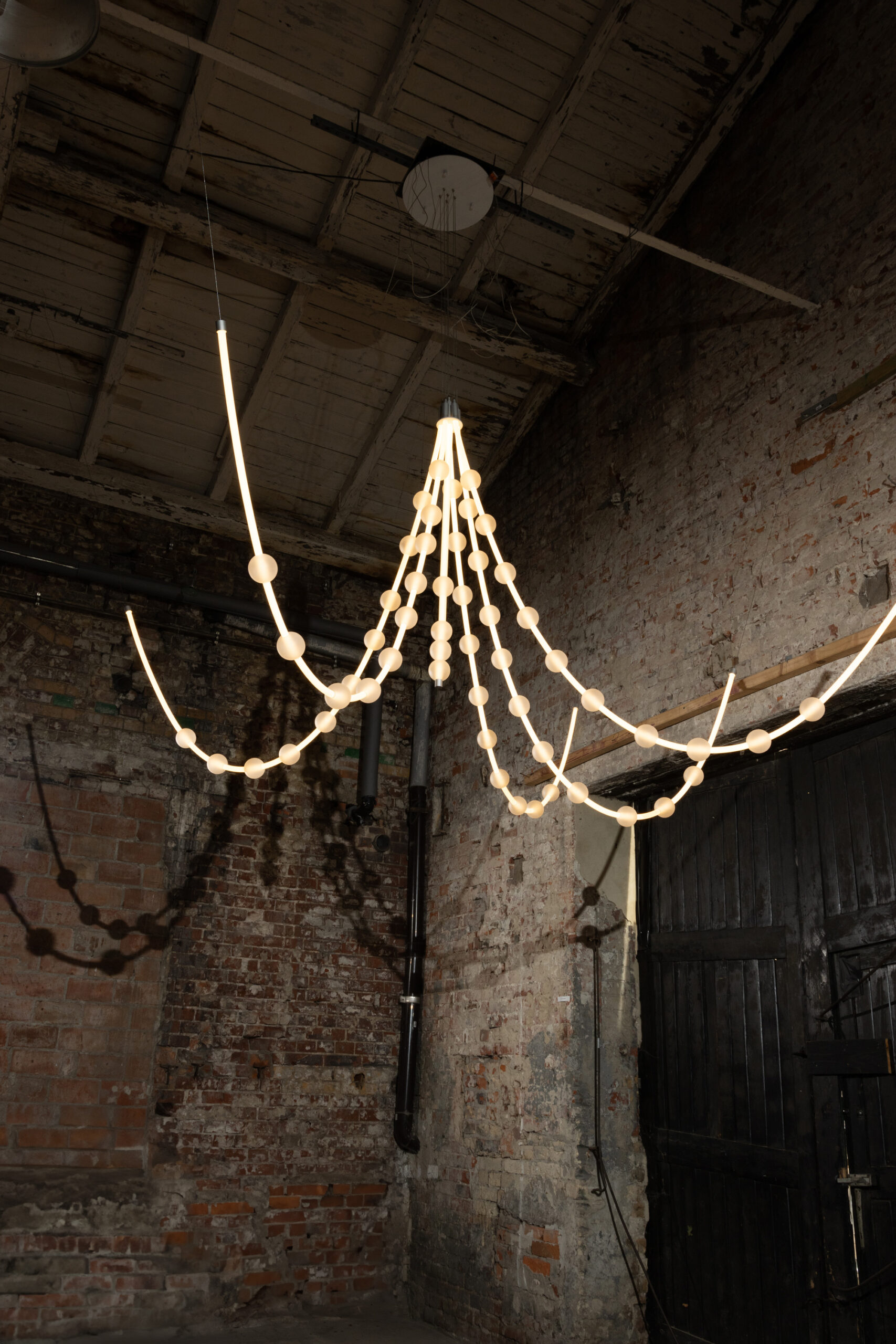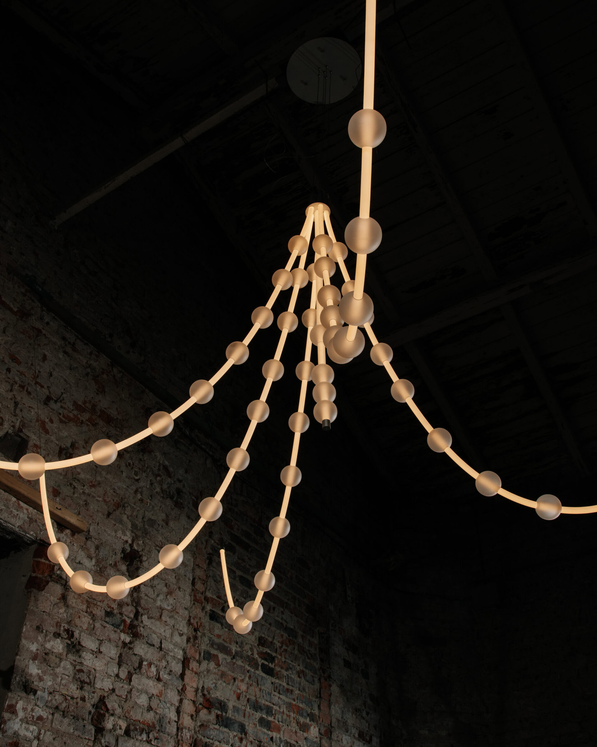 Each arm of the lamp can be freely arranged, while the glass spheres can be moved along the tubes, allowing the composition to be adapted to the interior. Perfect for tall spaces – whether residential or commercial – Mariska creates a breathtaking focal point.