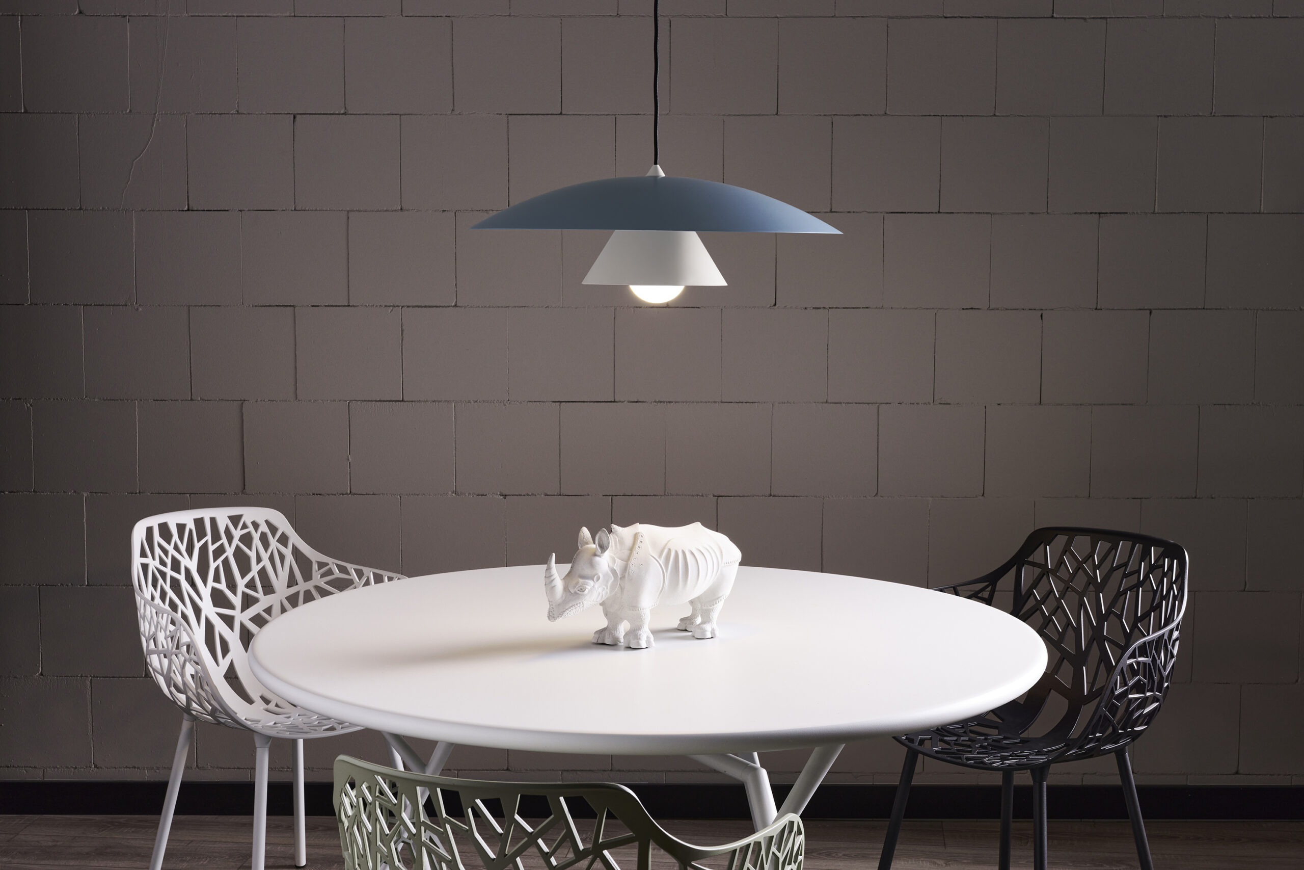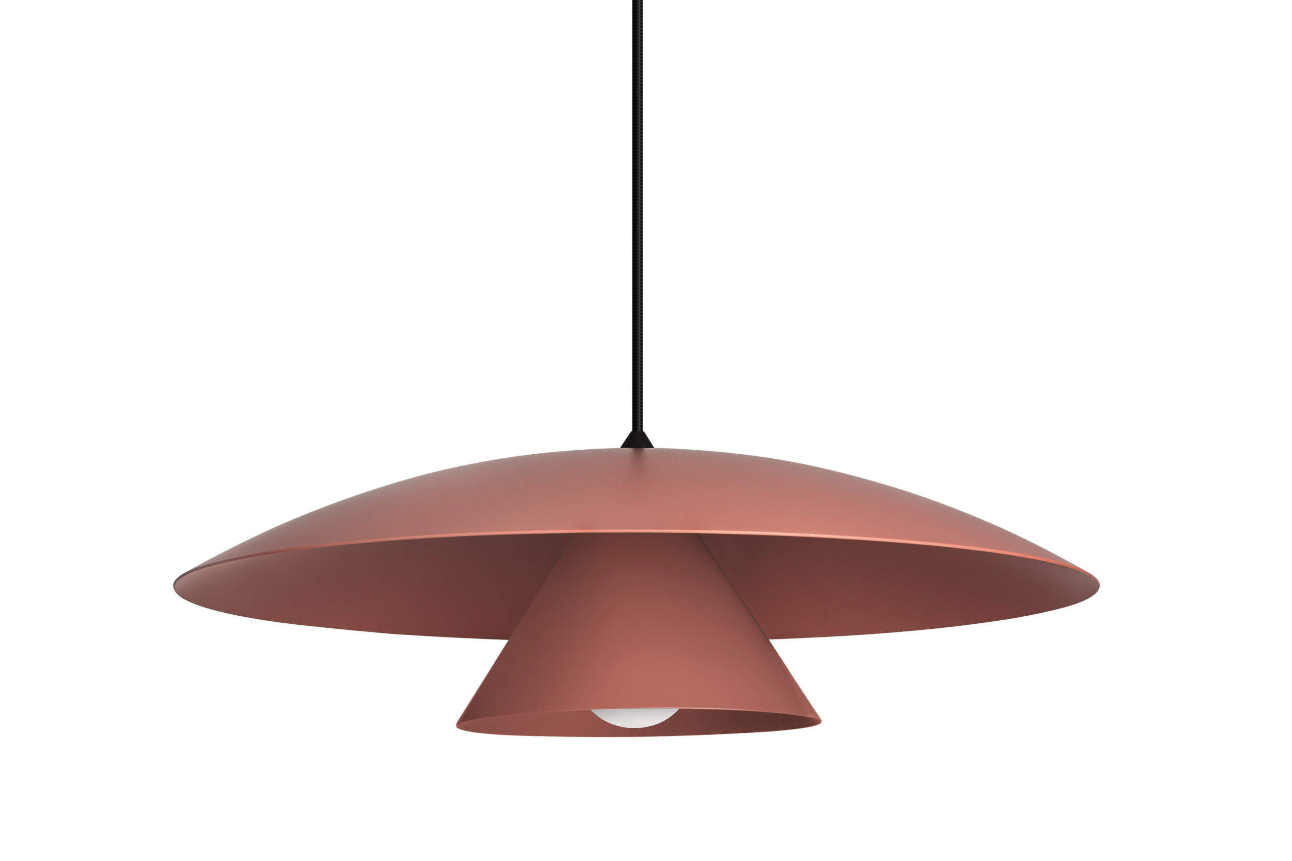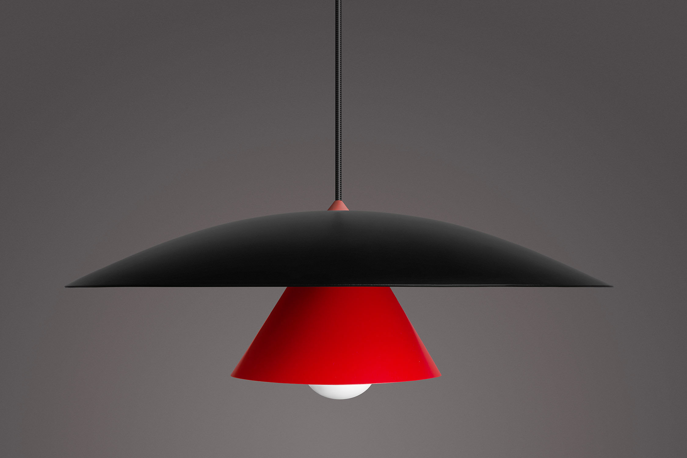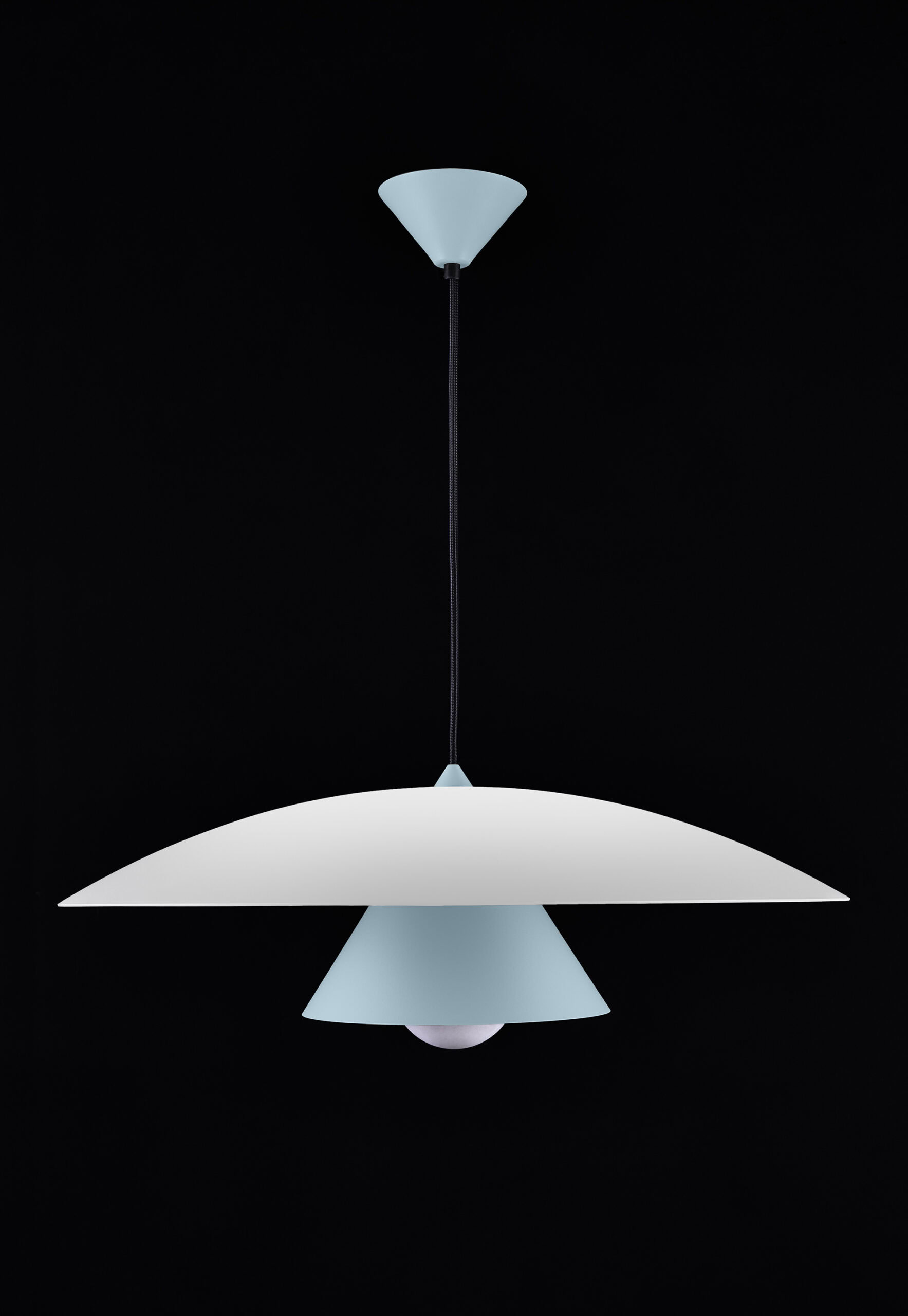 Olemi is a modern pendant lamp that brings together two classic shapes: the sphere and the cone. Its simple geometry gains new expression through a refined two-tone finish – the upper and lower parts of the shade are painted in different colours, accentuating the form and giving the lamp visual lightness. This subtle detail makes Olemi a highly versatile model, suitable for both modern and classically inspired interiors.