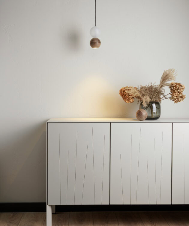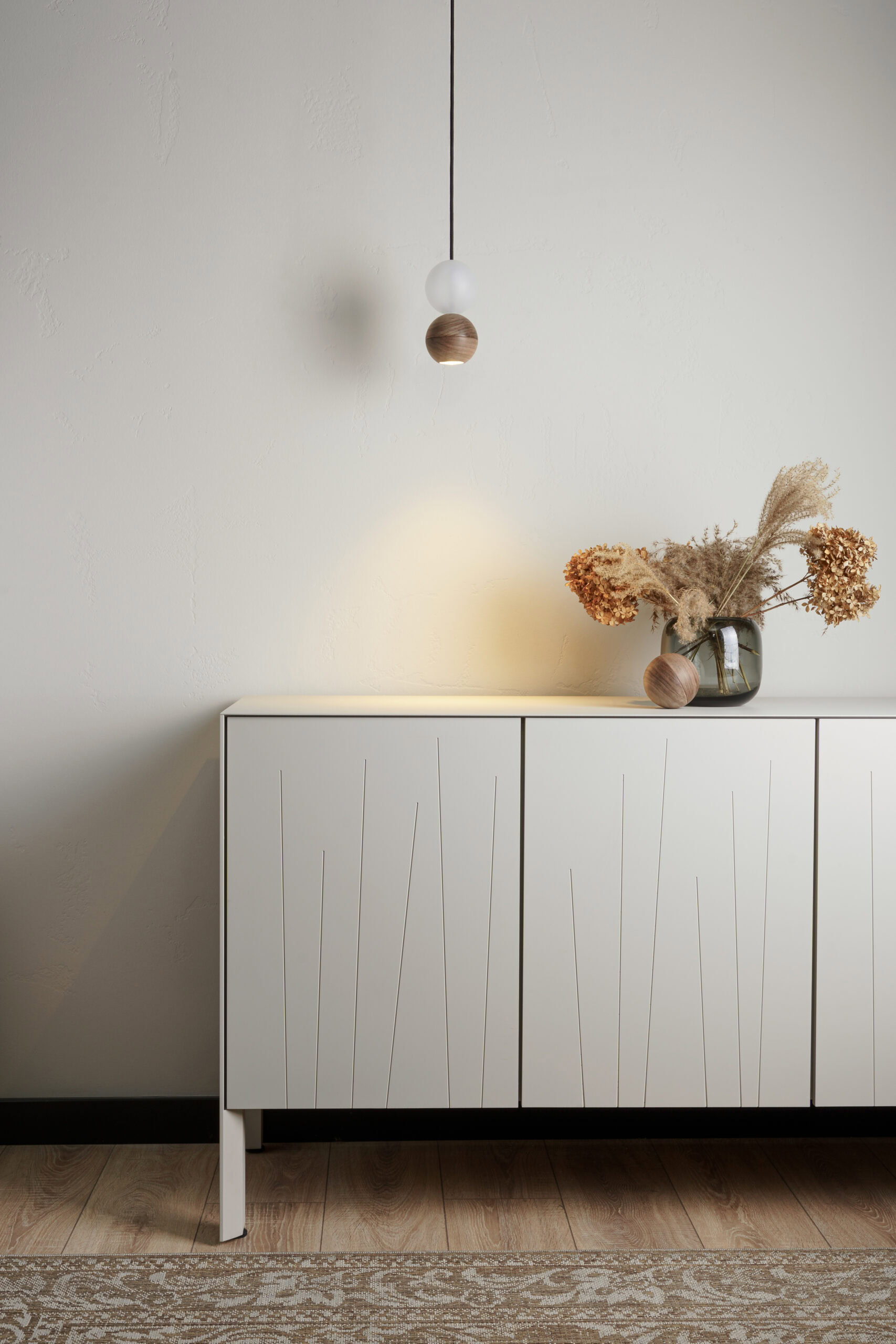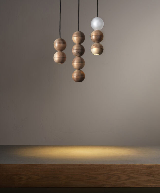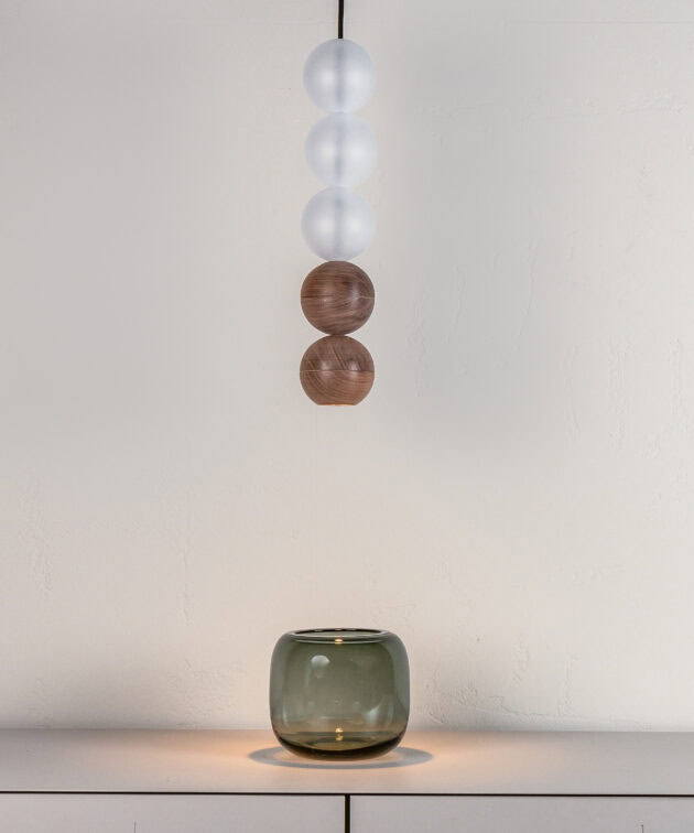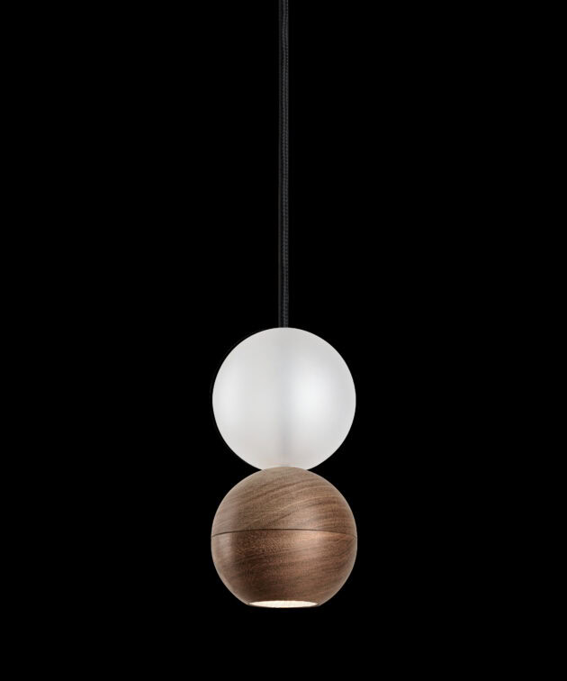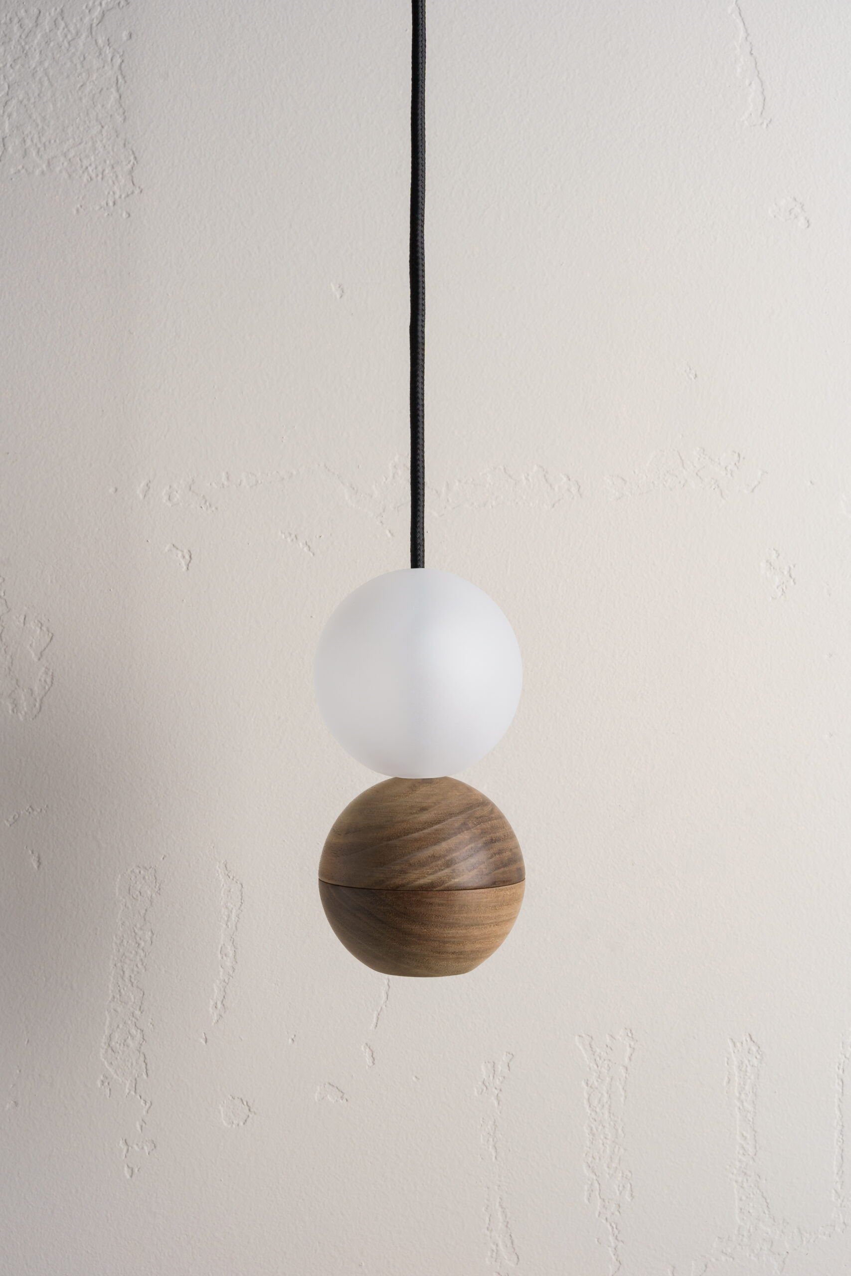Woodoo Glass is a pendant lamp that combines the raw beauty of solid American walnut with the subtle glow of a sandblasted glass sphere. This design continues the formal language of the Woodoo collection, enriched by contrasting textures and delicate light diffusion.